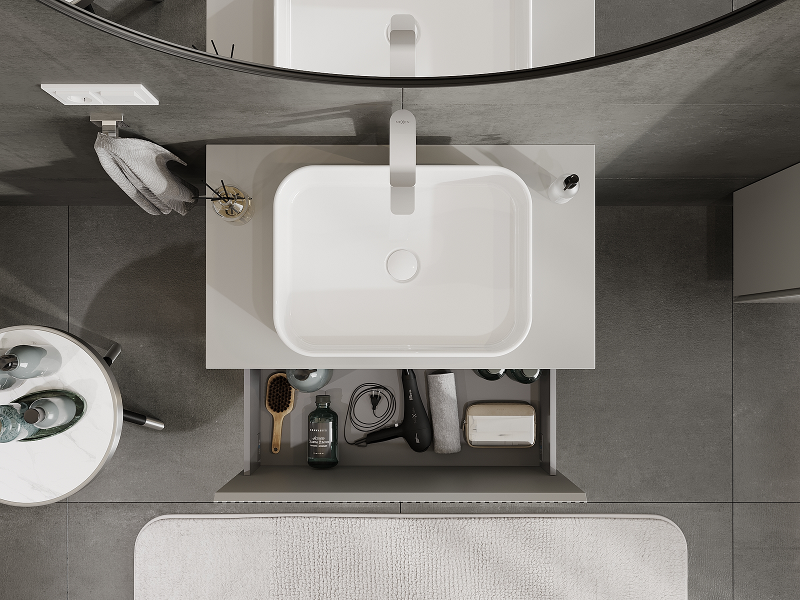 O recorte na gaveta é projetado de forma a acomodar o sifão, que é essencial em instalações de lavatórios. Graças a isso, o móvel pode ser montado de forma totalmente funcional, sem a necessidade de abdicar do espaço da gaveta em prol da instalação.