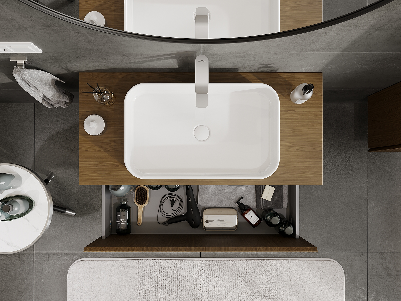 O recorte na gaveta é projetado de forma a acomodar o sifão, que é essencial em instalações de lavatórios. Graças a isso, o móvel pode ser montado de forma totalmente funcional, sem a necessidade de abdicar do espaço da gaveta em prol da instalação.