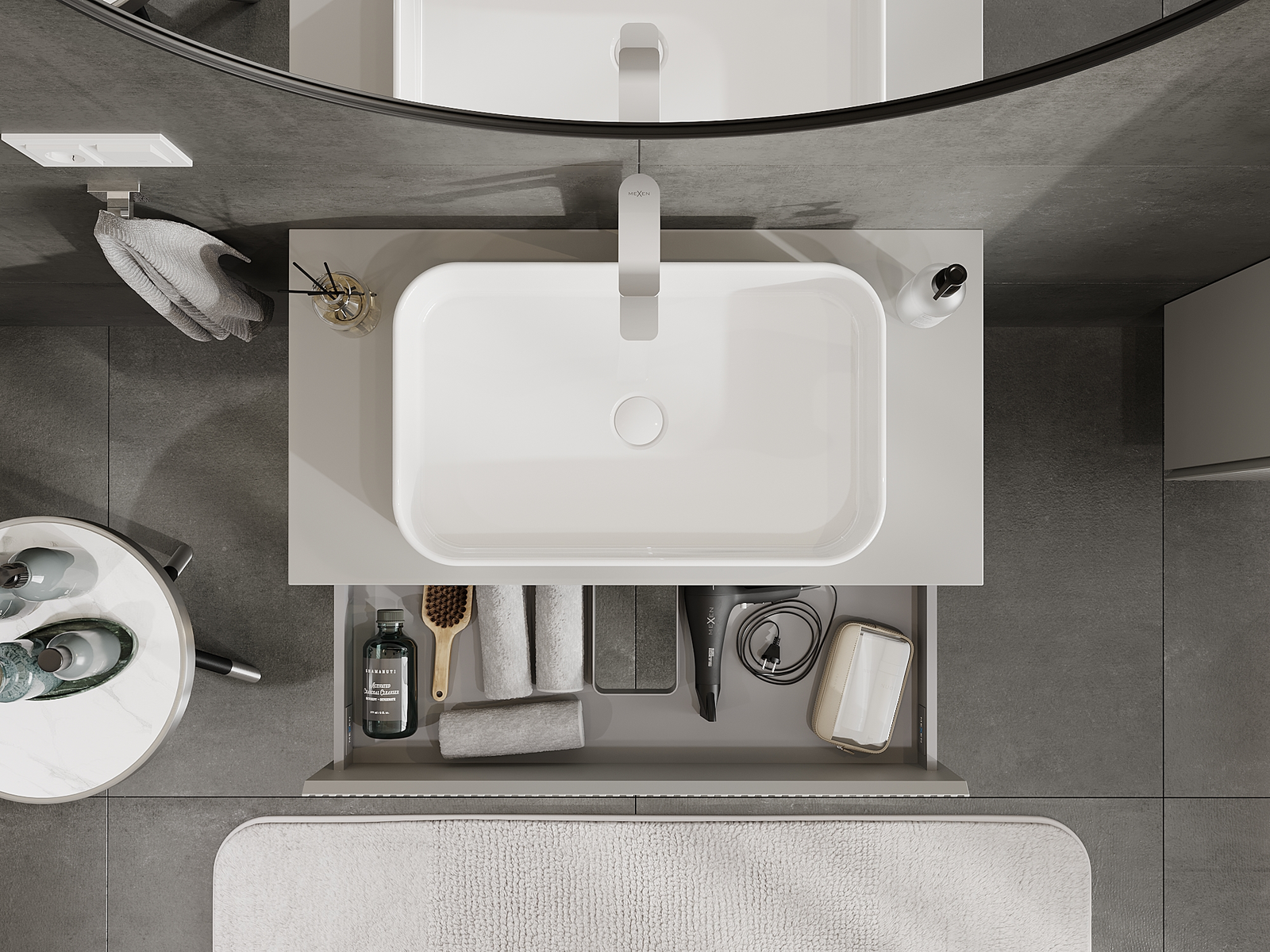 O recorte na gaveta é projetado de forma a acomodar o sifão, que é essencial em instalações de lavatórios. Graças a isso, o móvel pode ser montado de forma totalmente funcional, sem a necessidade de abdicar do espaço da gaveta em prol da instalação.