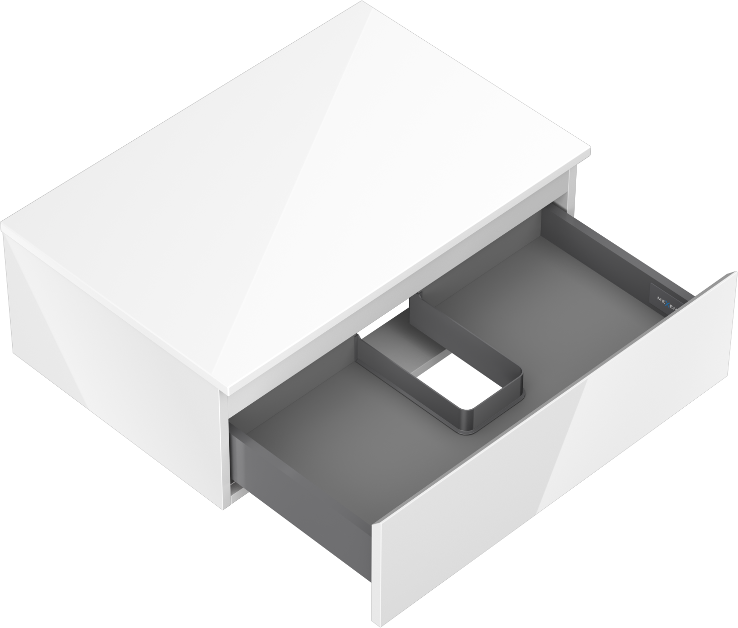 O recorte na gaveta é projetado de forma a acomodar o sifão, que é essencial em instalações de lavatórios. Graças a isso, o móvel pode ser montado de forma totalmente funcional, sem a necessidade de abdicar do espaço da gaveta em prol da instalação.