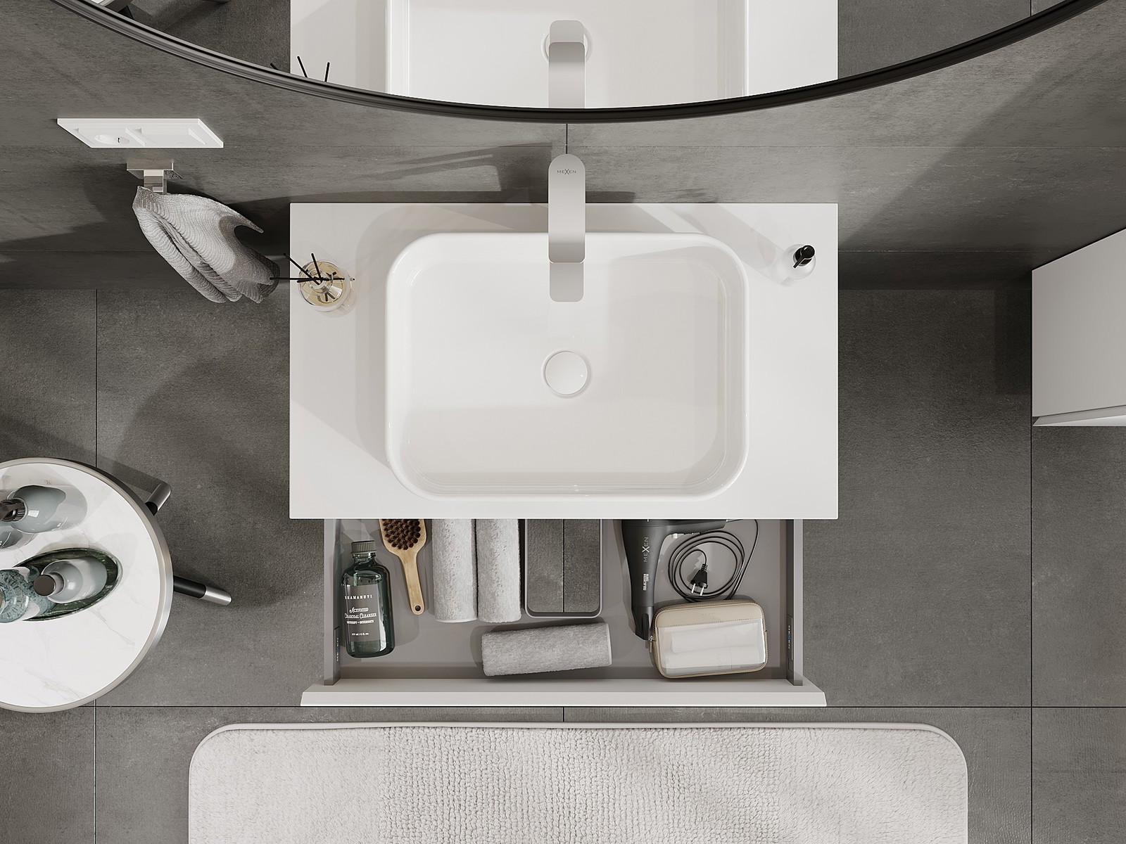 O recorte na gaveta é projetado de forma a acomodar o sifão, que é essencial em instalações de lavatórios. Graças a isso, o móvel pode ser montado de forma totalmente funcional, sem a necessidade de abdicar do espaço da gaveta em prol da instalação.