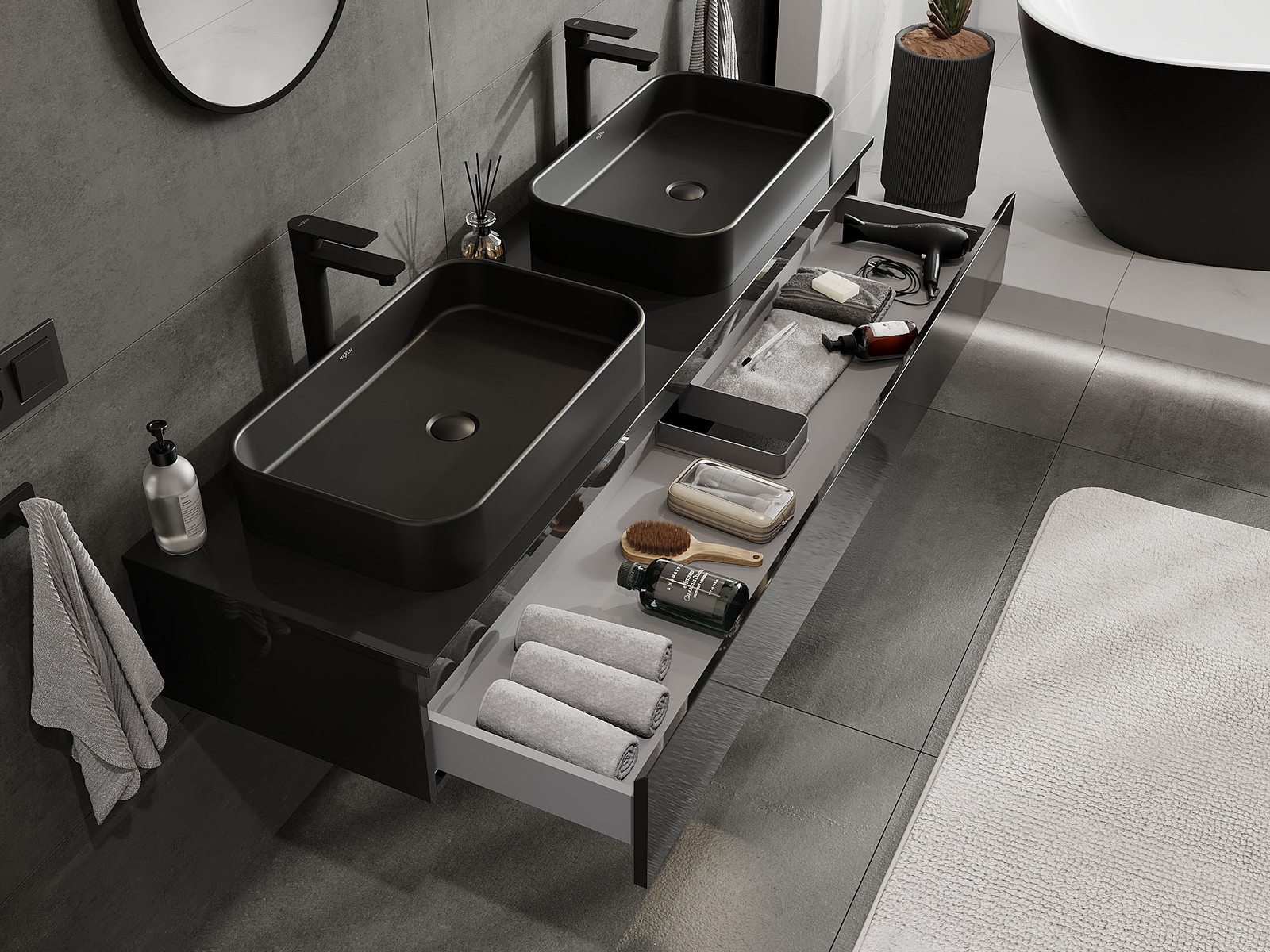 Mexen Orio armário de casa de banho de 160 cm com tampo, 1 gaveta, preto brilhante - 91A10-16023-1-BFC70