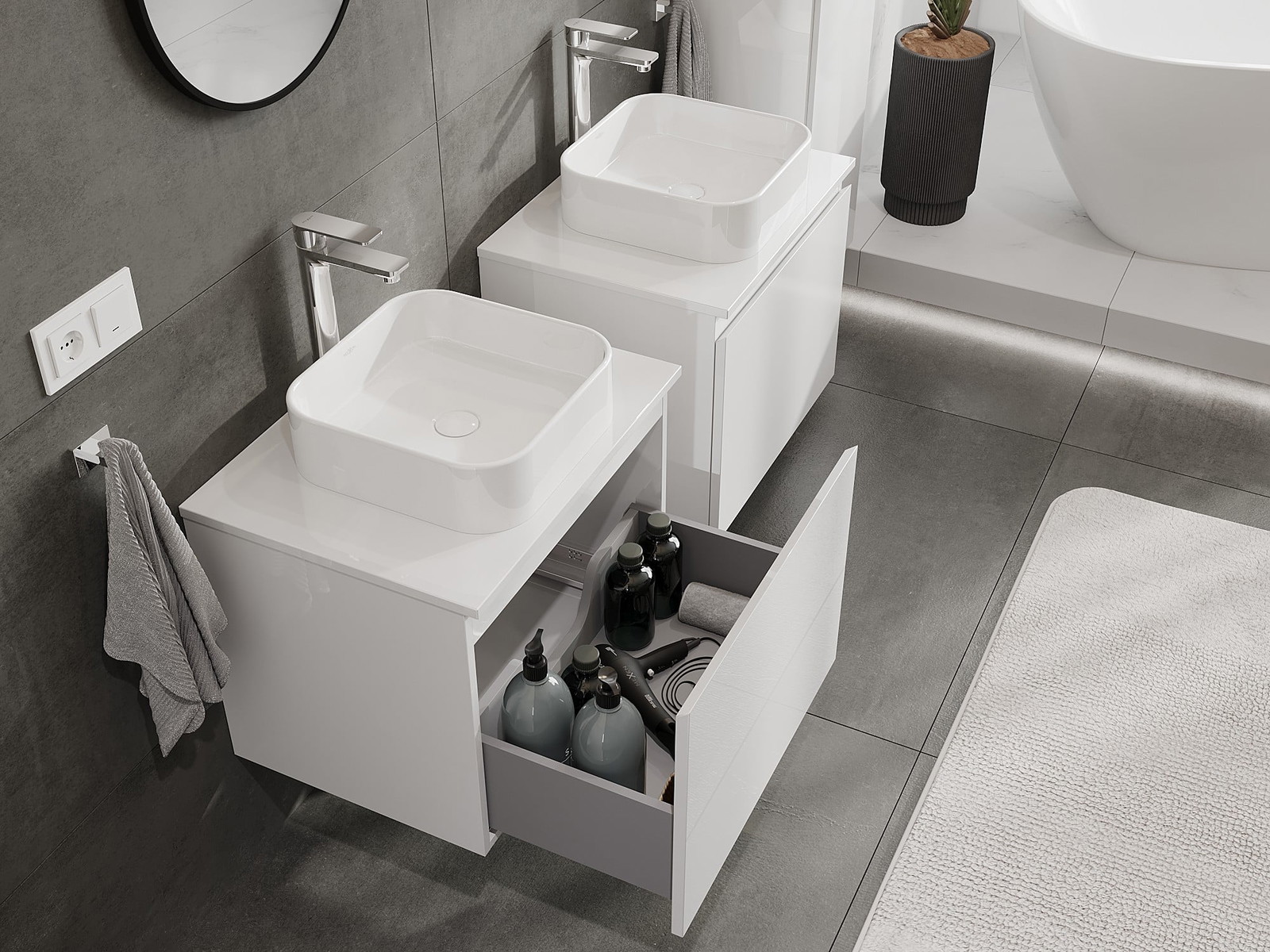 Os nossos móveis de casa de banho modulares podem ser combinados em várias configurações de cores, permitindo total personalização. Pode escolher tanto a aparência como as funções de cada elemento, o que permite ajustar os móveis às suas próprias preferências de estilo e uso.