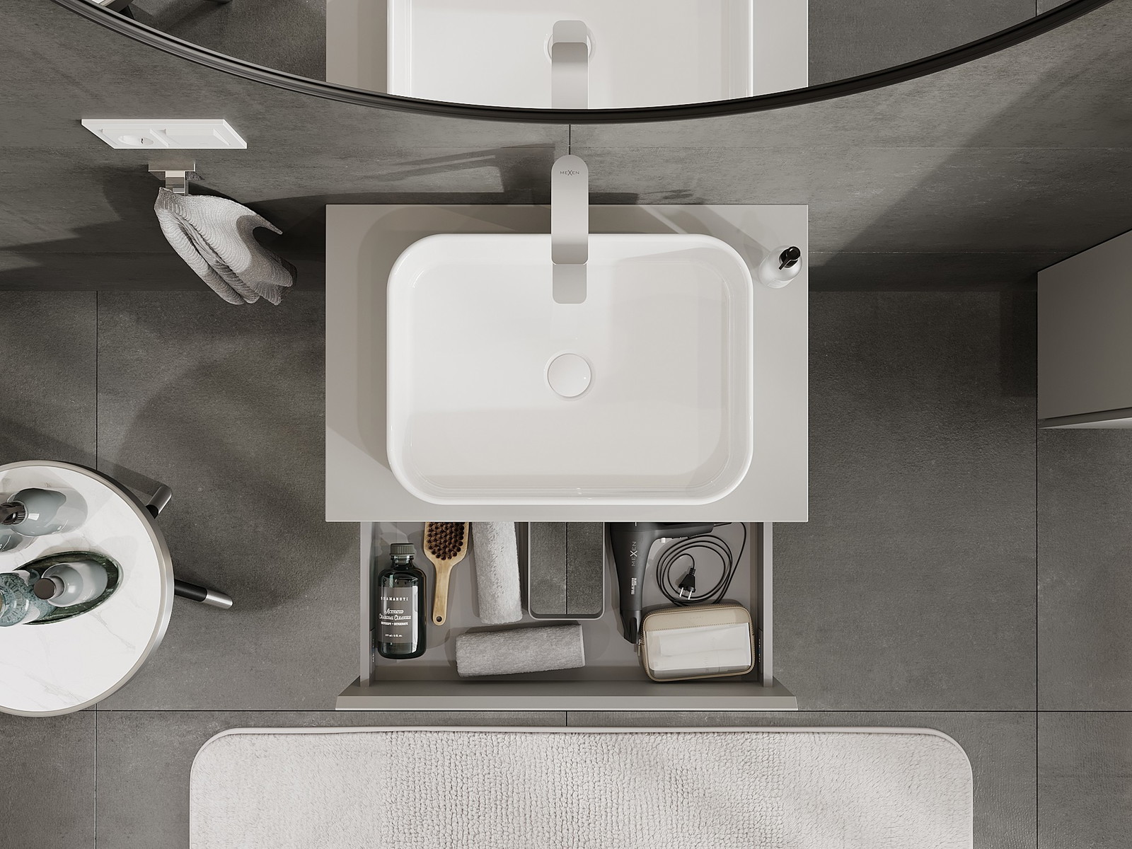 O recorte na gaveta é projetado de forma a acomodar o sifão, que é essencial em instalações de lavatórios. Graças a isso, o móvel pode ser montado de forma totalmente funcional, sem a necessidade de abdicar do espaço da gaveta em prol da instalação.