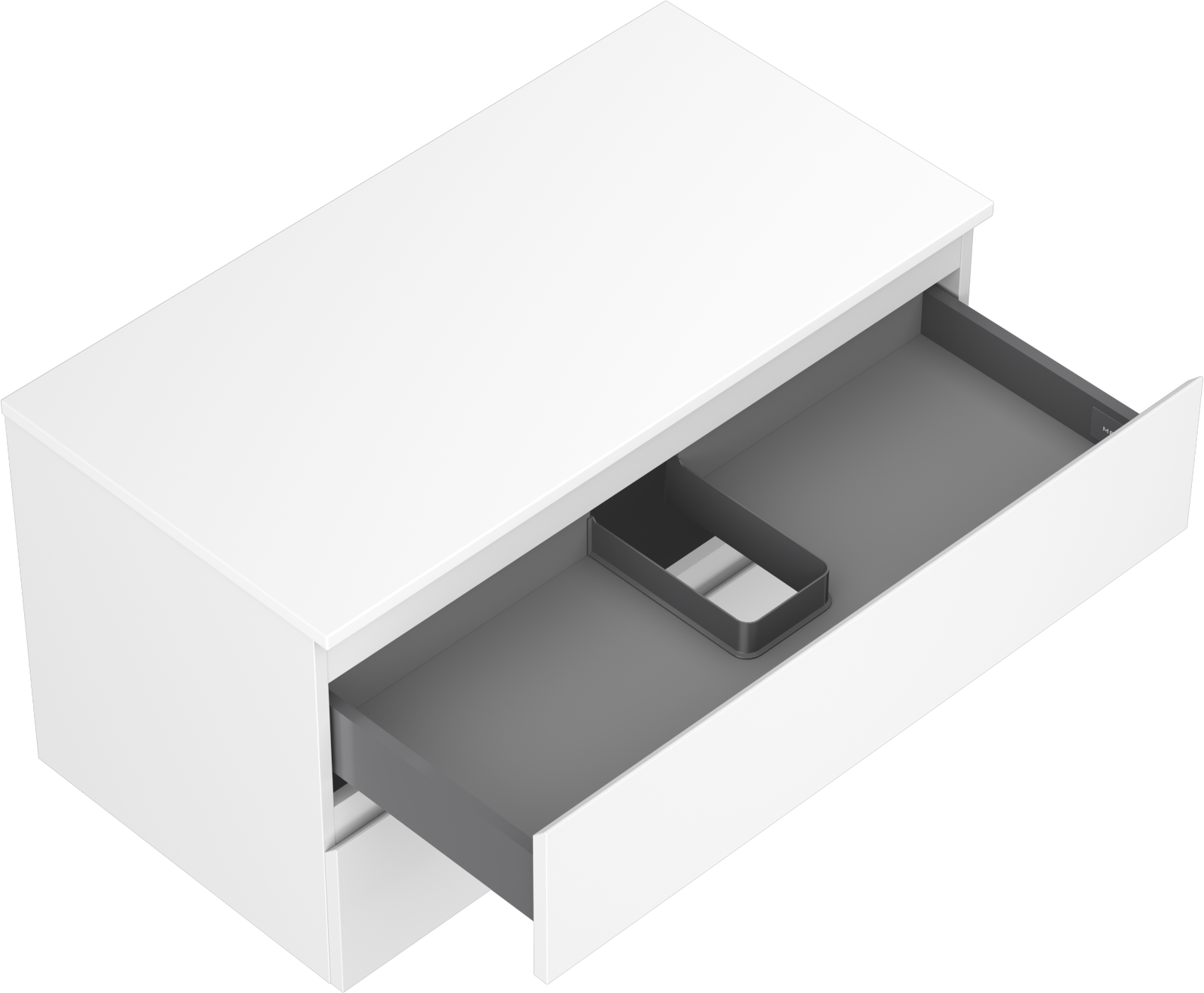 O recorte na gaveta é projetado de forma a acomodar o sifão, que é essencial em instalações de lavatórios. Graças a isso, o móvel pode ser montado de forma totalmente funcional, sem a necessidade de abdicar do espaço da gaveta em prol da instalação.