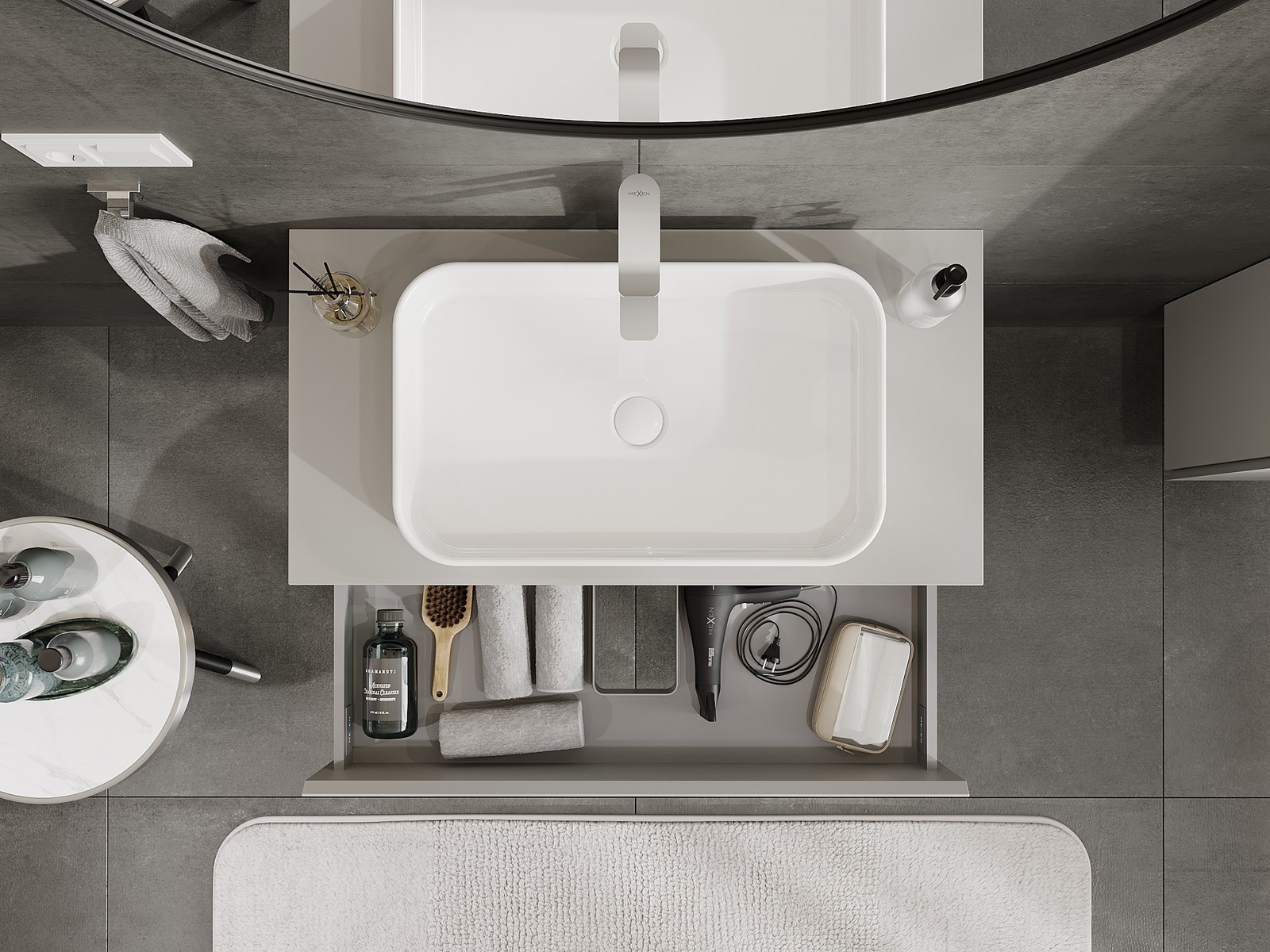 O recorte na gaveta é projetado de forma a acomodar o sifão, que é essencial em instalações de lavatórios. Graças a isso, o móvel pode ser montado de forma totalmente funcional, sem a necessidade de abdicar do espaço da gaveta em prol da instalação.