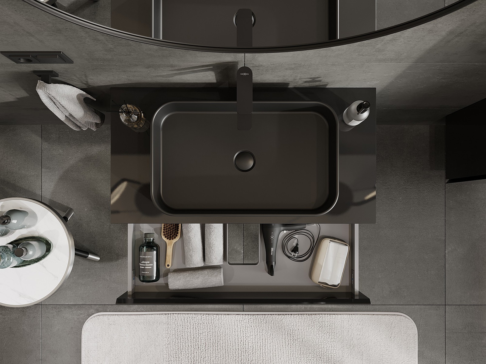 O recorte na gaveta é projetado de forma a acomodar o sifão, que é essencial em instalações de lavatórios. Graças a isso, o móvel pode ser montado de forma totalmente funcional, sem a necessidade de abdicar do espaço da gaveta em prol da instalação.