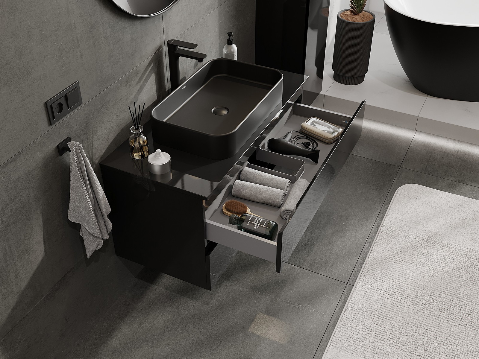 Mexen Orio armário de casa de banho para lavatório 100 cm com tampo, 2 gavetas, preto brilhante - 91A10-10047-2-BFFC70
