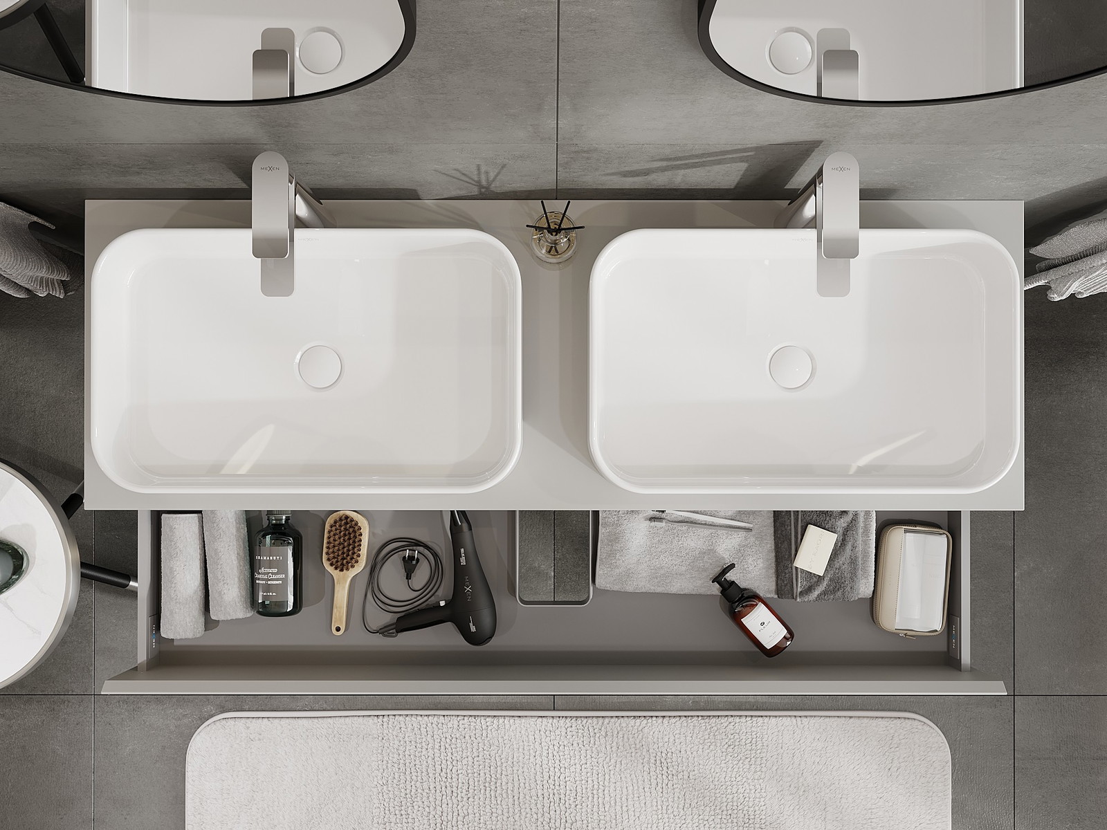 O recorte na gaveta é projetado de forma a acomodar o sifão, que é essencial em instalações de lavatórios. Graças a isso, o móvel pode ser montado de forma totalmente funcional, sem a necessidade de abdicar do espaço da gaveta em prol da instalação.