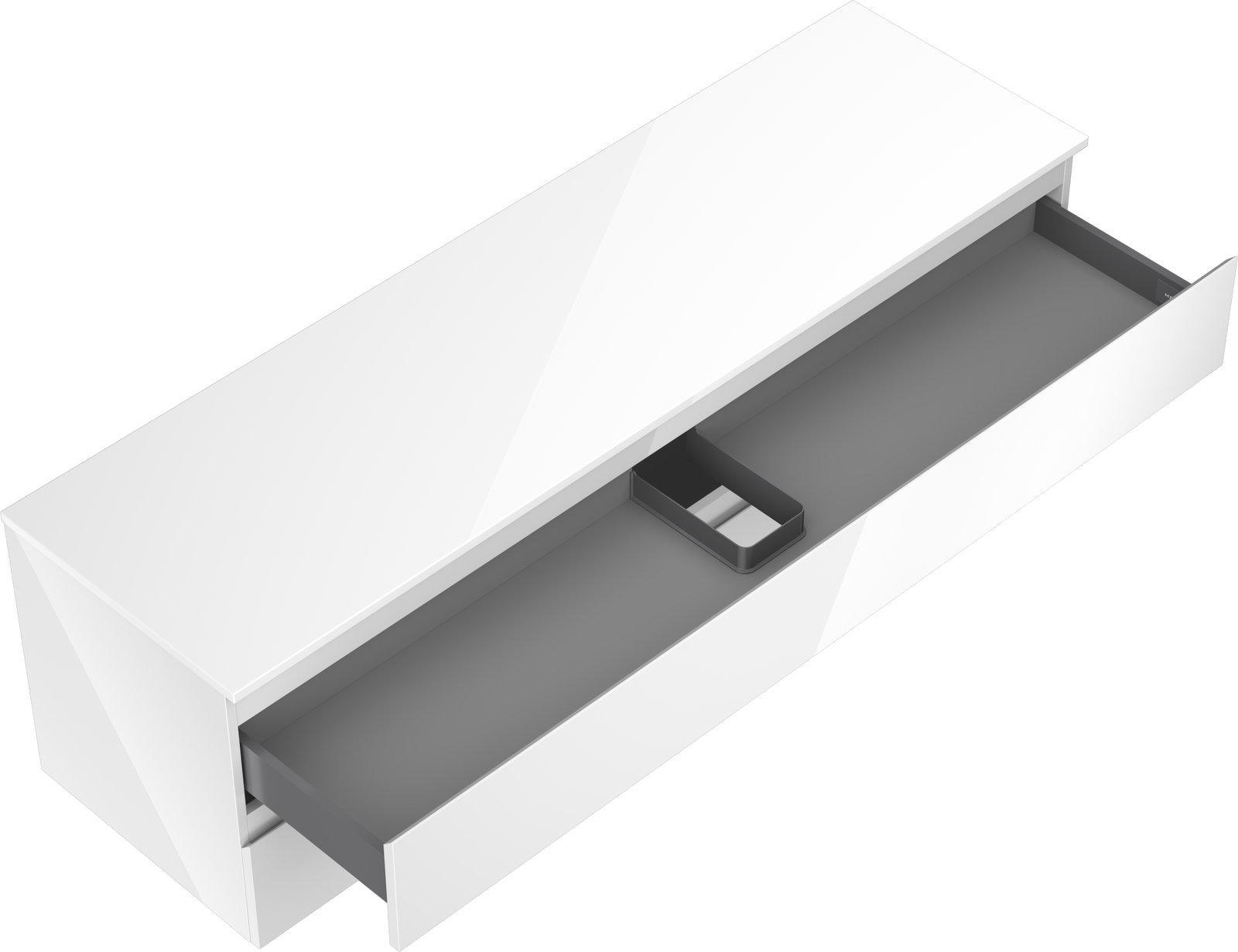 O recorte na gaveta é projetado de forma a acomodar o sifão, que é essencial em instalações de lavatórios. Graças a isso, o móvel pode ser montado de forma totalmente funcional, sem a necessidade de abdicar do espaço da gaveta em prol da instalação.