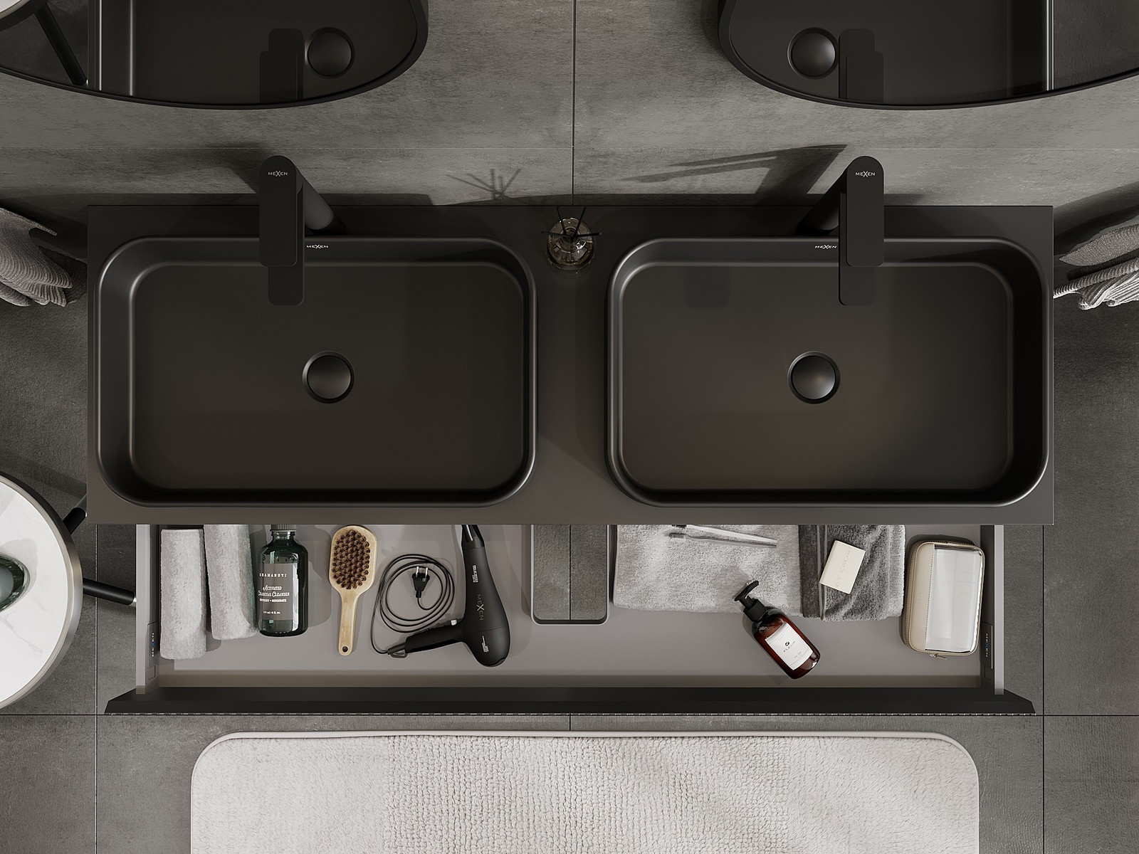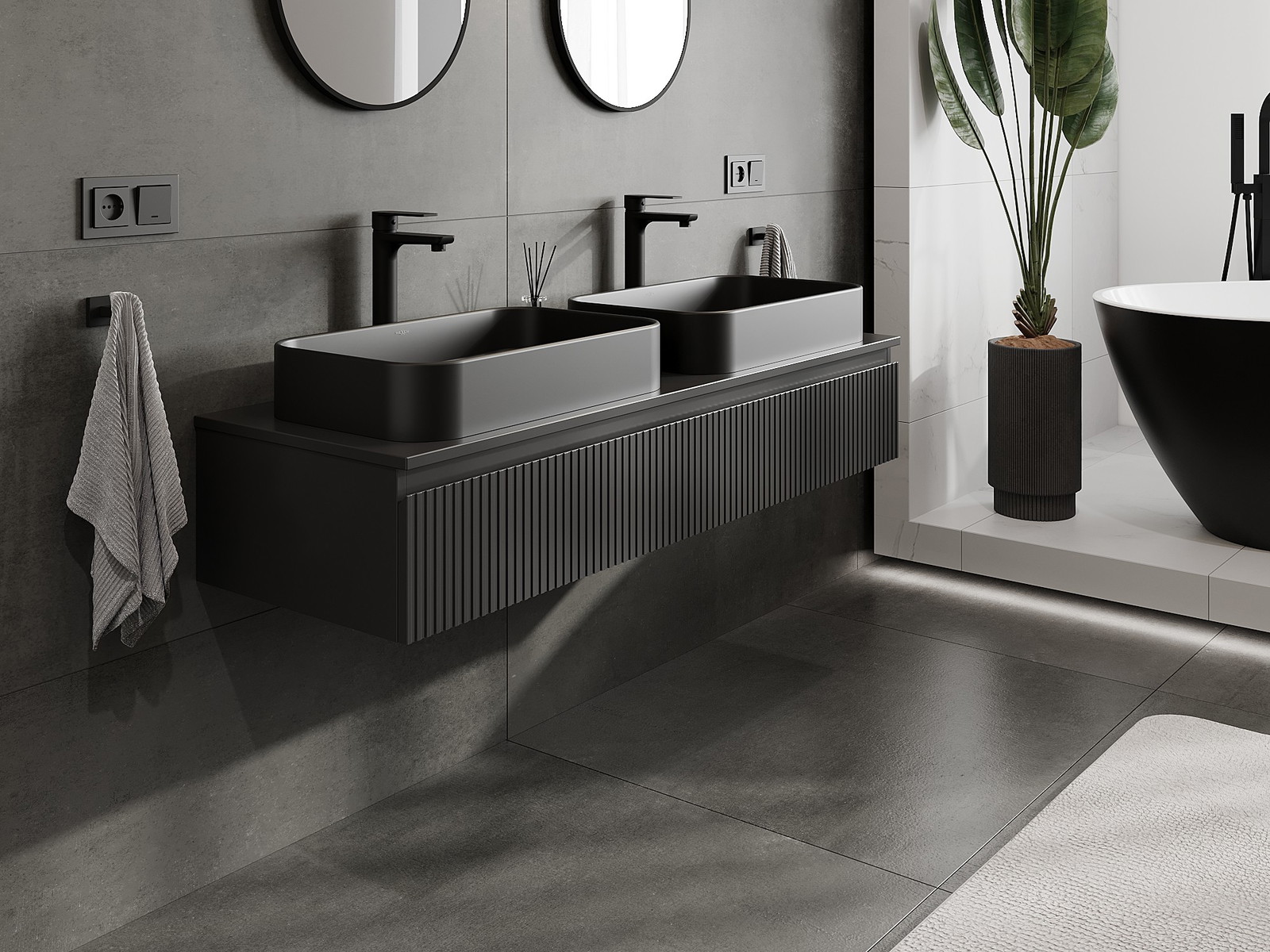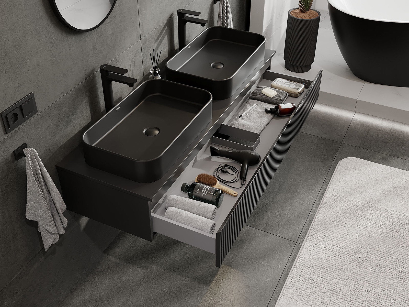 Mexen Rivel armário de casa de banho para lavatório com 140 cm com tampo, 1 gaveta, canelado, preto mate - 91A20-14023-1-BFC71