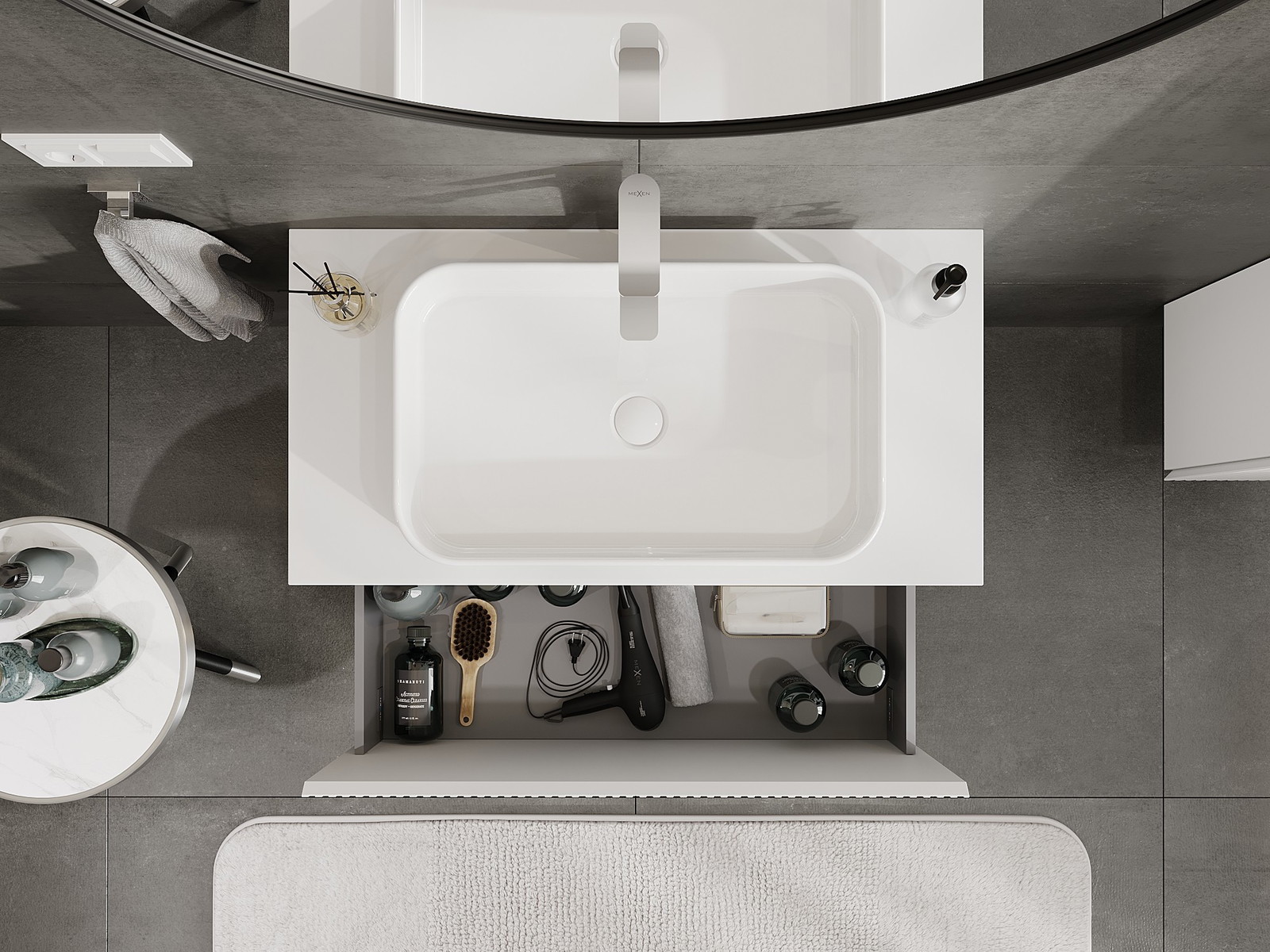 O recorte na gaveta é projetado de forma a acomodar o sifão, que é essencial em instalações de lavatórios. Graças a isso, o móvel pode ser montado de forma totalmente funcional, sem a necessidade de abdicar do espaço da gaveta em prol da instalação.