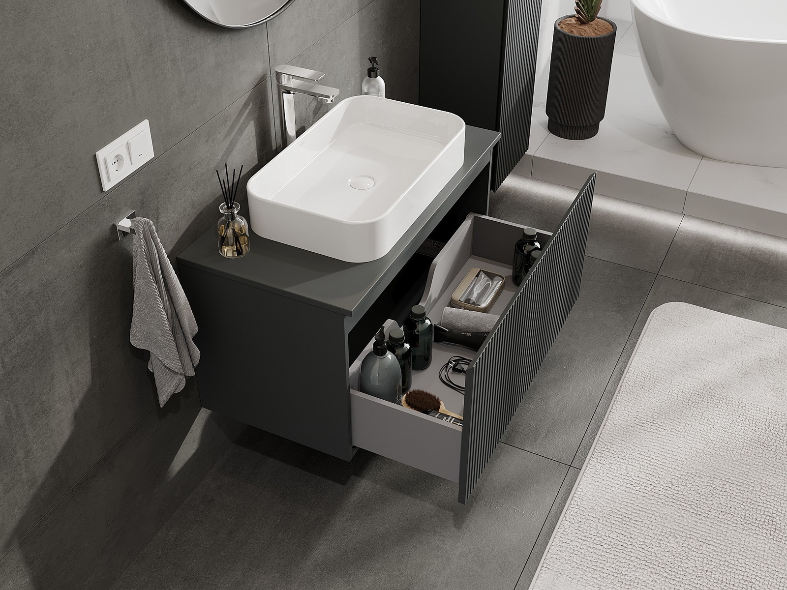 Mexen Rivel armário de casa de banho para lavatório 90 cm com tampo, 1 gaveta, canelado, grafite mate - 91A20-09047-1-BFC66