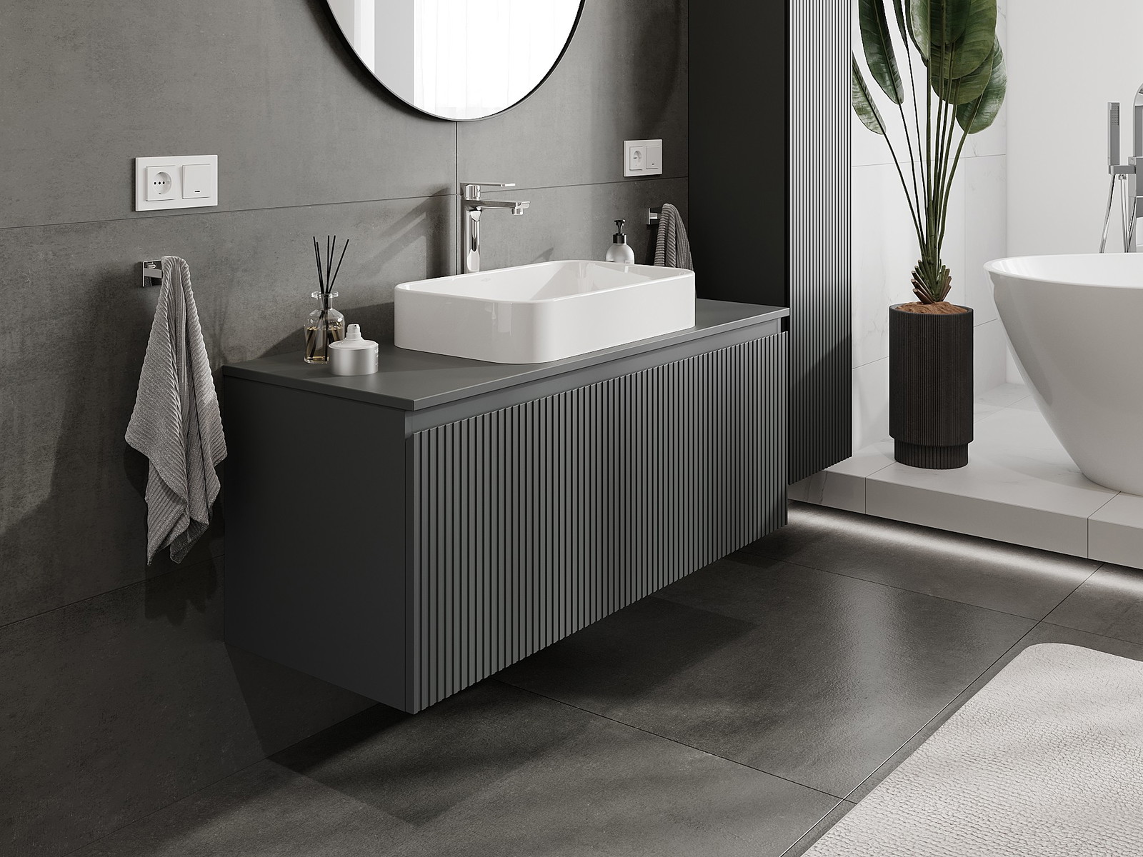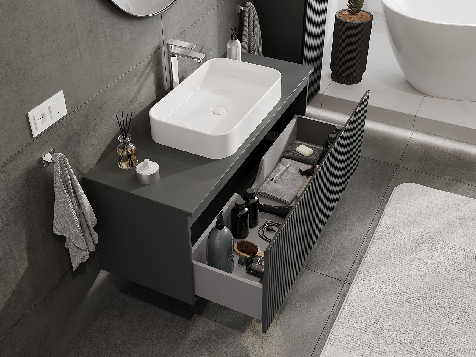 Mexen Rivel armário de casa de banho sob lavatório 120 cm com tampo, 1 gaveta, estriado, grafite mate - 91A20-12047-1-BFC66