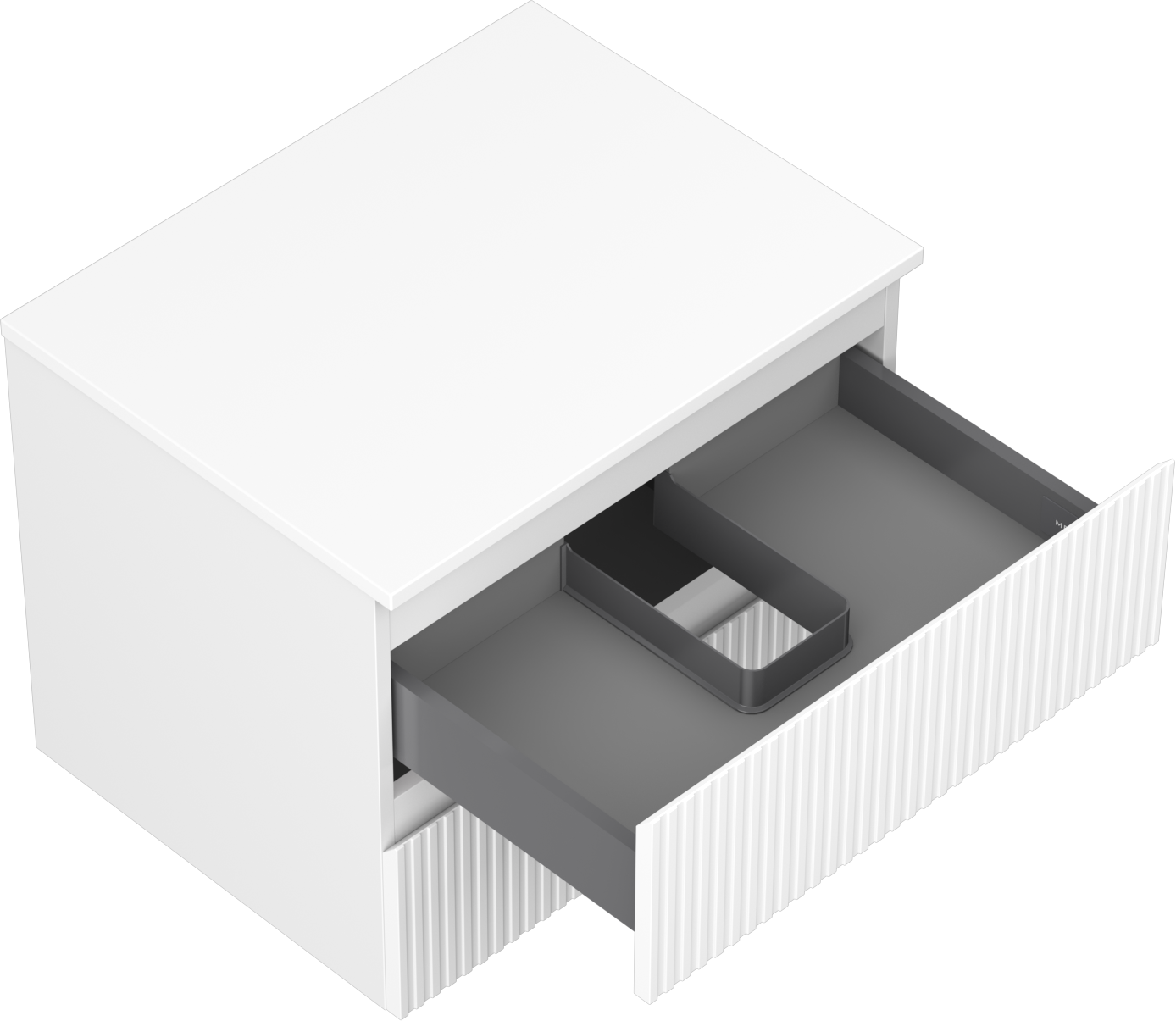 O recorte na gaveta é projetado de forma a acomodar o sifão, que é essencial em instalações de lavatórios. Graças a isso, o móvel pode ser montado de forma totalmente funcional, sem a necessidade de abdicar do espaço da gaveta em prol da instalação.