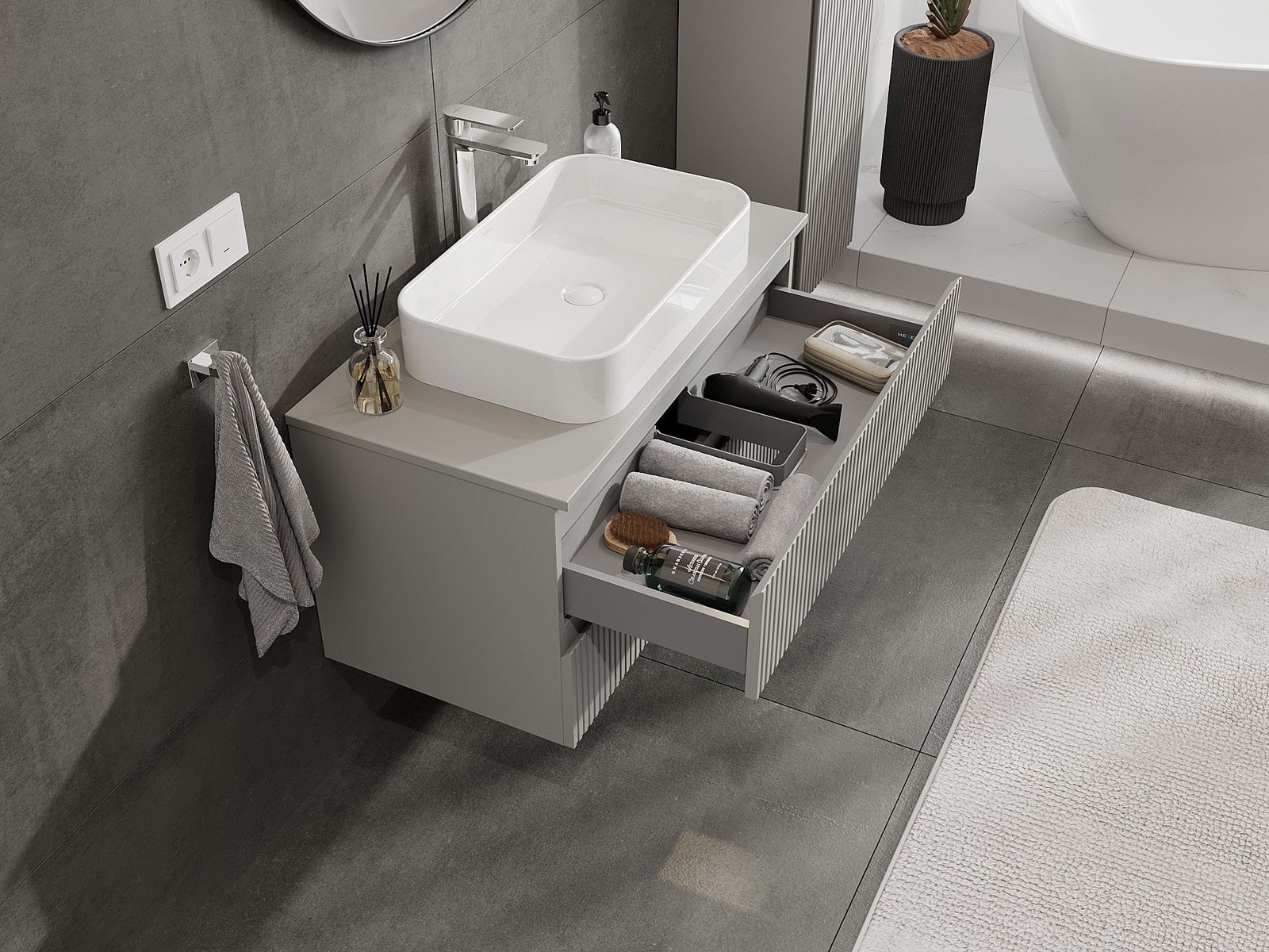 O recorte na gaveta é projetado de forma a acomodar o sifão, que é essencial em instalações de lavatórios. Graças a isso, o móvel pode ser montado de forma totalmente funcional, sem a necessidade de abdicar do espaço da gaveta em prol da instalação.