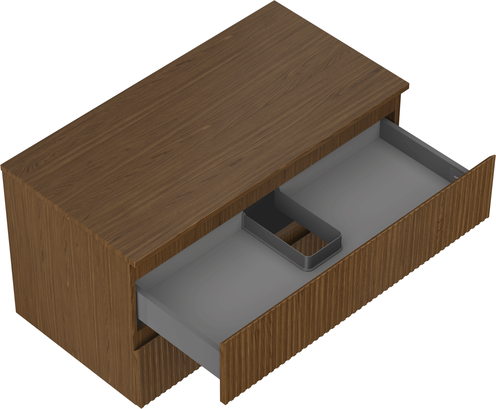 O recorte na gaveta é projetado de forma a acomodar o sifão, que é essencial em instalações de lavatórios. Graças a isso, o móvel pode ser montado de forma totalmente funcional, sem a necessidade de abdicar do espaço da gaveta em prol da instalação.