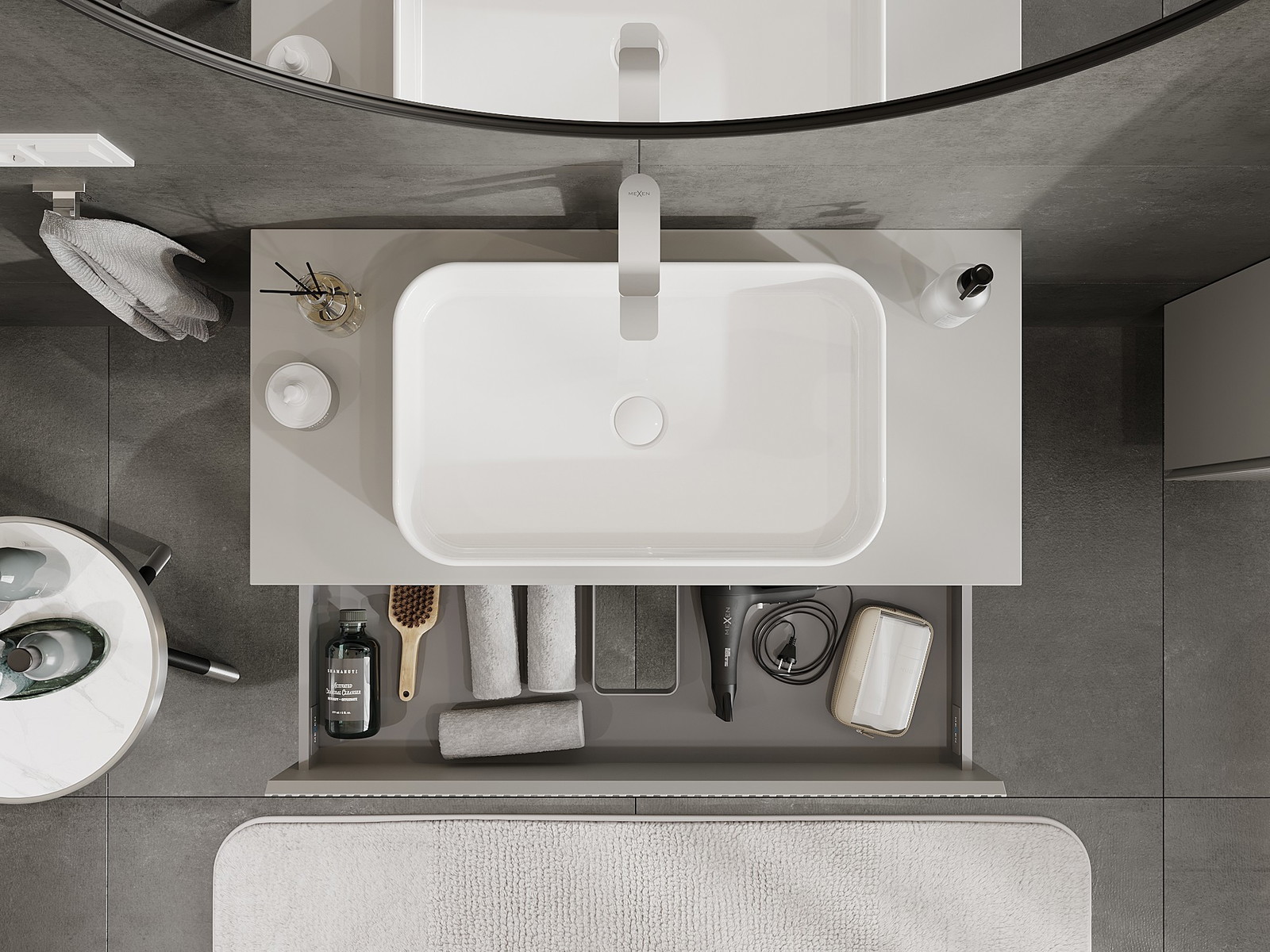 O recorte na gaveta é projetado de forma a acomodar o sifão, que é essencial em instalações de lavatórios. Graças a isso, o móvel pode ser montado de forma totalmente funcional, sem a necessidade de abdicar do espaço da gaveta em prol da instalação.