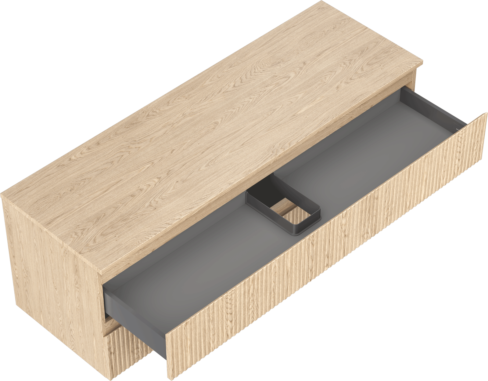 O recorte na gaveta é projetado de forma a acomodar o sifão, que é essencial em instalações de lavatórios. Graças a isso, o móvel pode ser montado de forma totalmente funcional, sem a necessidade de abdicar do espaço da gaveta em prol da instalação.