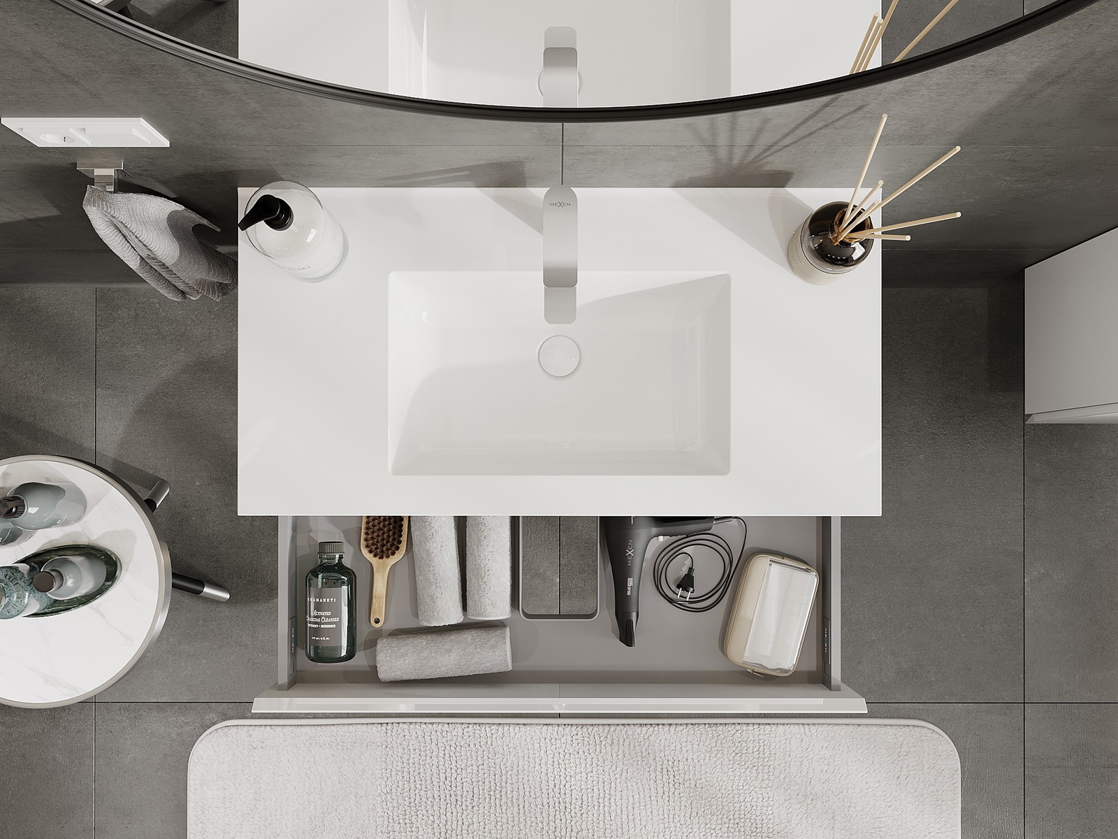 O recorte na gaveta é projetado de forma a acomodar o sifão, que é essencial em instalações de lavatórios. Graças a isso, o móvel pode ser montado de forma totalmente funcional, sem a necessidade de abdicar do espaço da gaveta em prol da instalação.