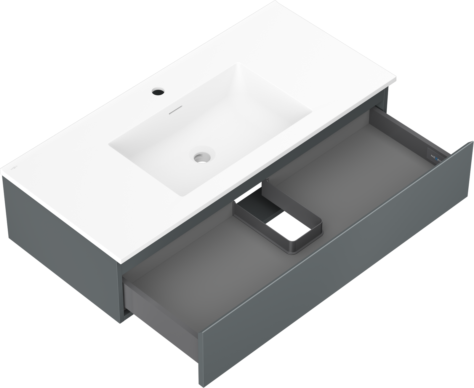 O recorte na gaveta é projetado de forma a acomodar o sifão, que é essencial em instalações de lavatórios. Graças a isso, o móvel pode ser montado de forma totalmente funcional, sem a necessidade de abdicar do espaço da gaveta em prol da instalação.