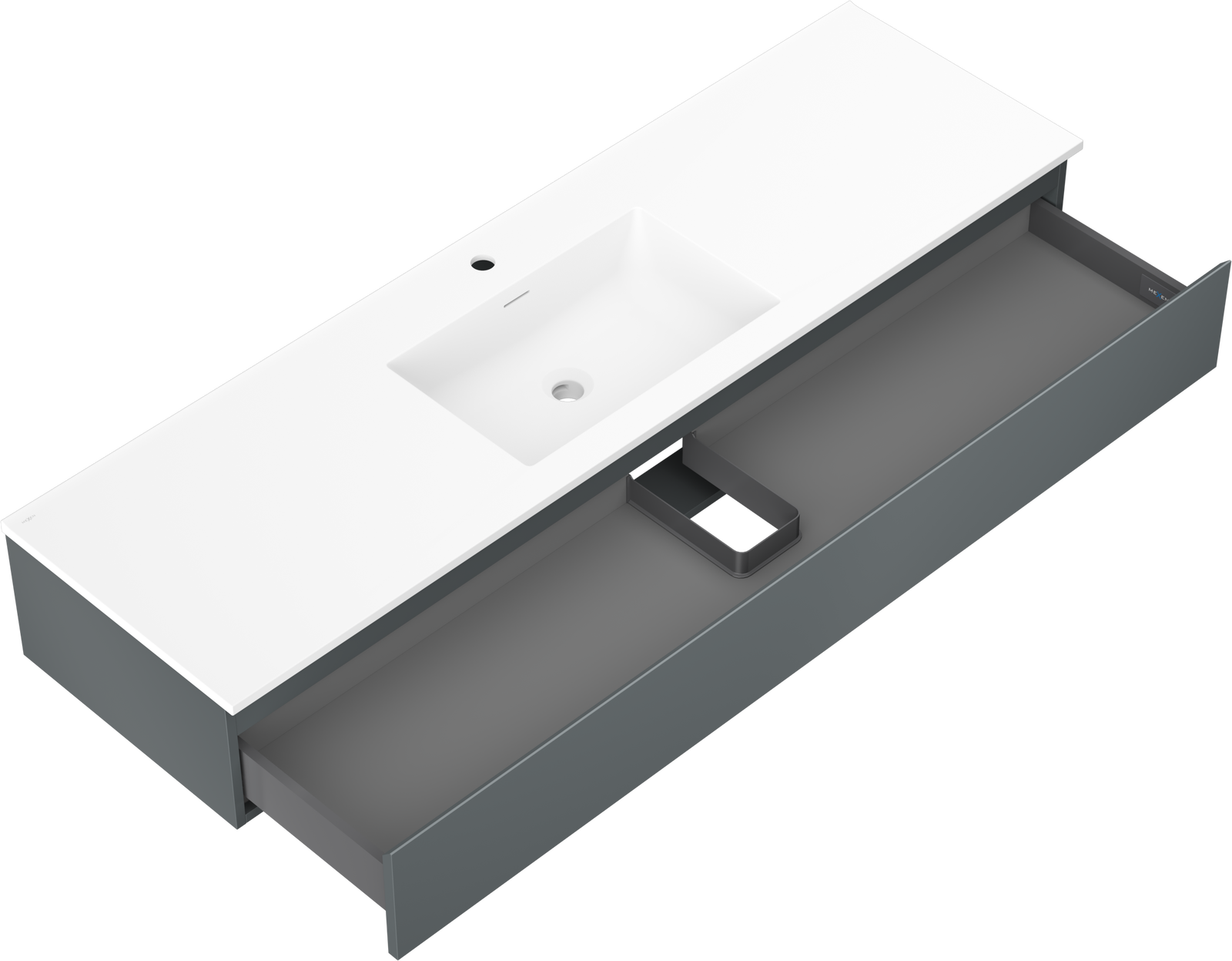O recorte na gaveta é projetado de forma a acomodar o sifão, que é essencial em instalações de lavatórios. Graças a isso, o móvel pode ser montado de forma totalmente funcional, sem a necessidade de abdicar do espaço da gaveta em prol da instalação.
