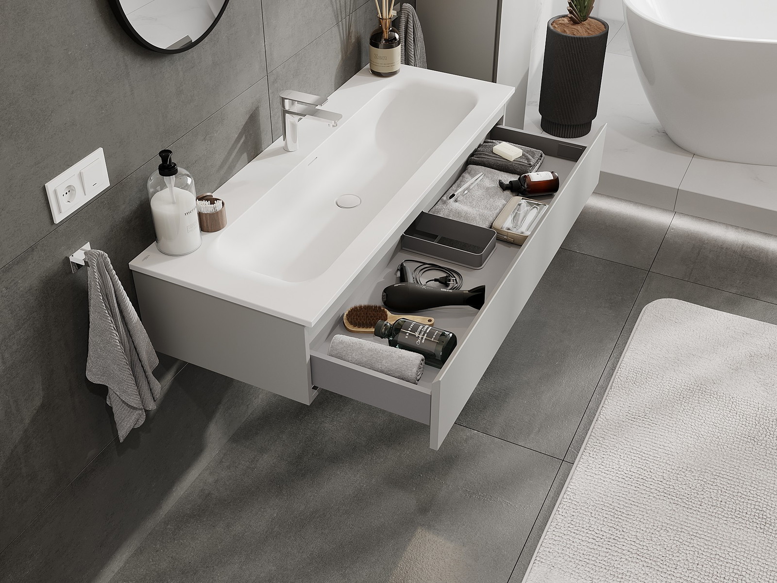 O recorte na gaveta é projetado de forma a acomodar o sifão, que é essencial em instalações de lavatórios. Graças a isso, o móvel pode ser montado de forma totalmente funcional, sem a necessidade de abdicar do espaço da gaveta em prol da instalação.