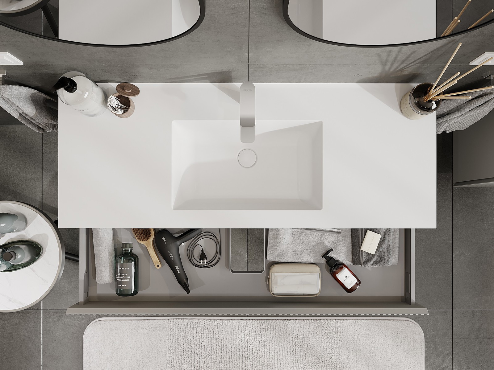 O recorte na gaveta é projetado de forma a acomodar o sifão, que é essencial em instalações de lavatórios. Graças a isso, o móvel pode ser montado de forma totalmente funcional, sem a necessidade de abdicar do espaço da gaveta em prol da instalação.