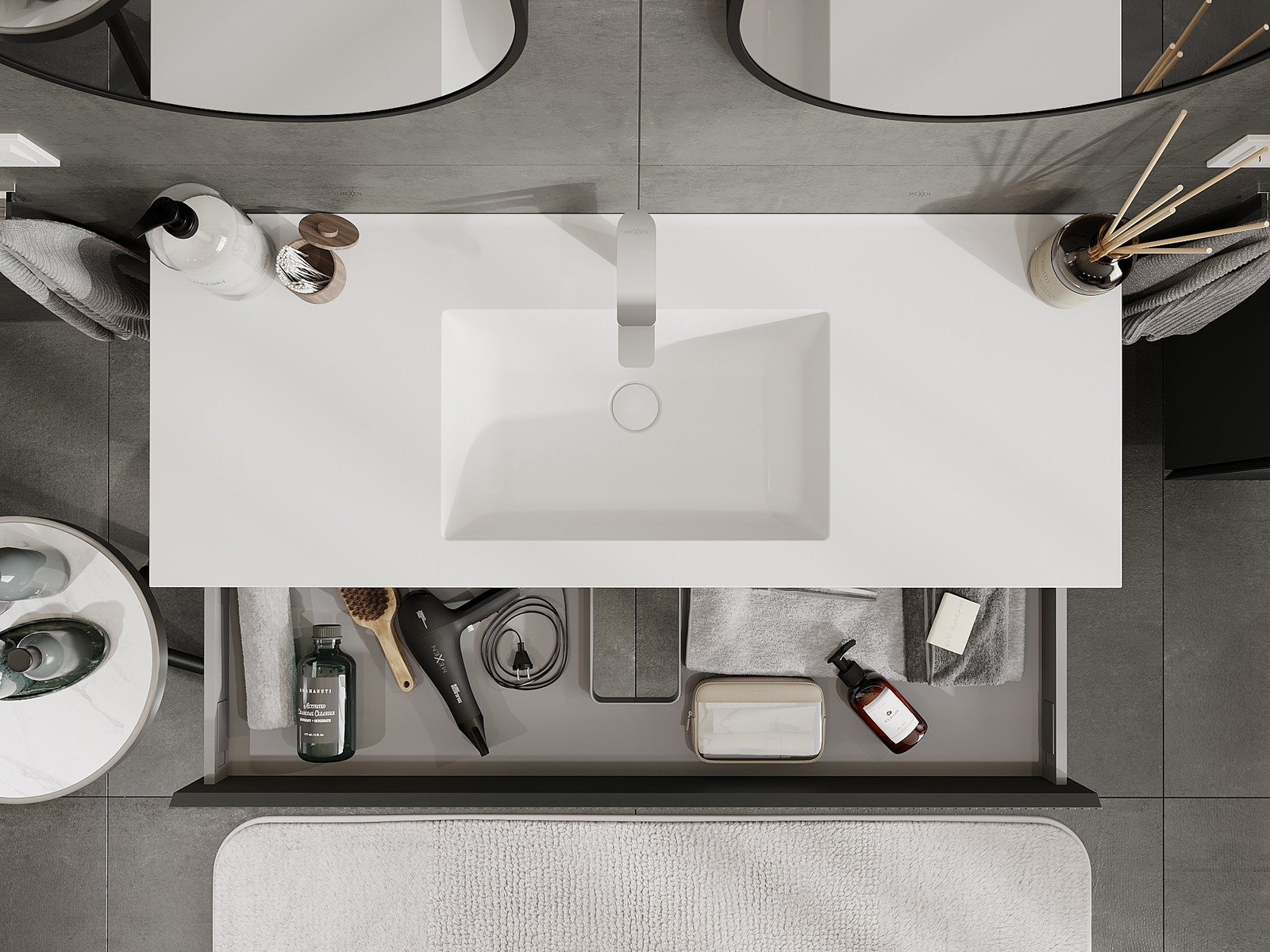 O recorte na gaveta é projetado de forma a acomodar o sifão, que é essencial em instalações de lavatórios. Graças a isso, o móvel pode ser montado de forma totalmente funcional, sem a necessidade de abdicar do espaço da gaveta em prol da instalação.