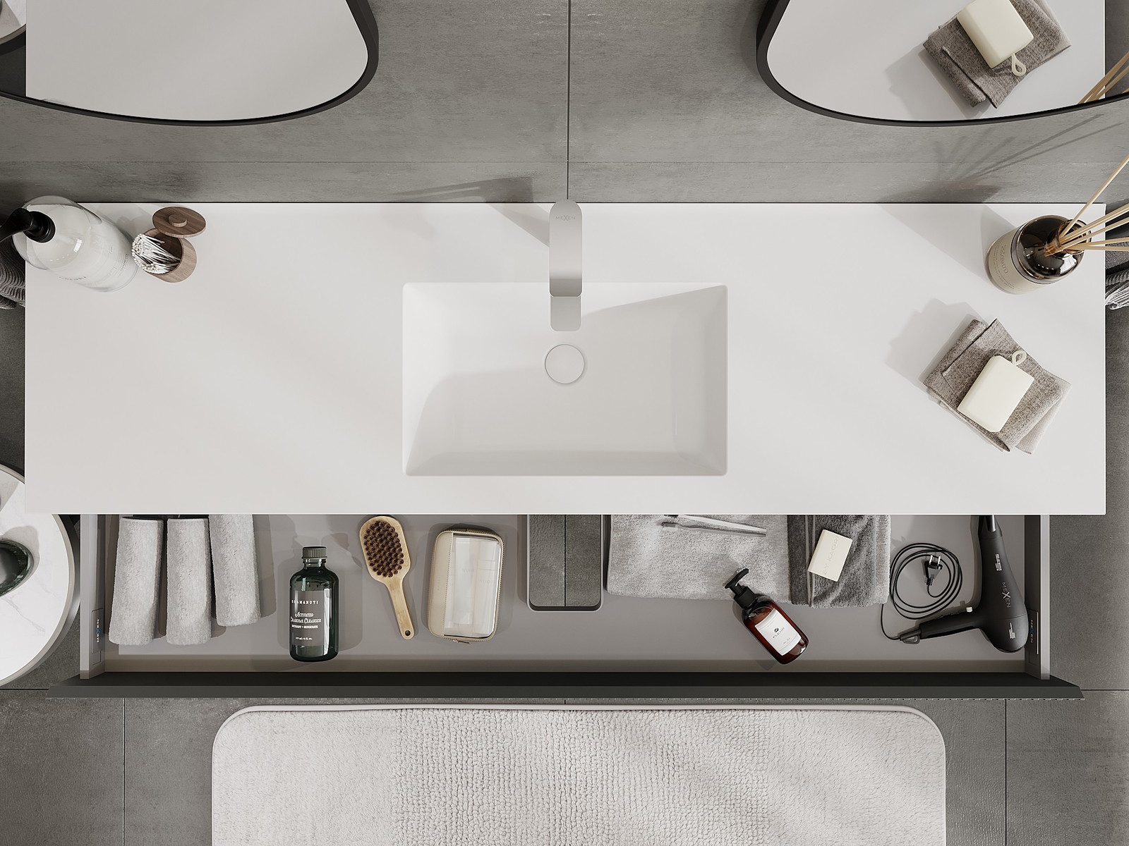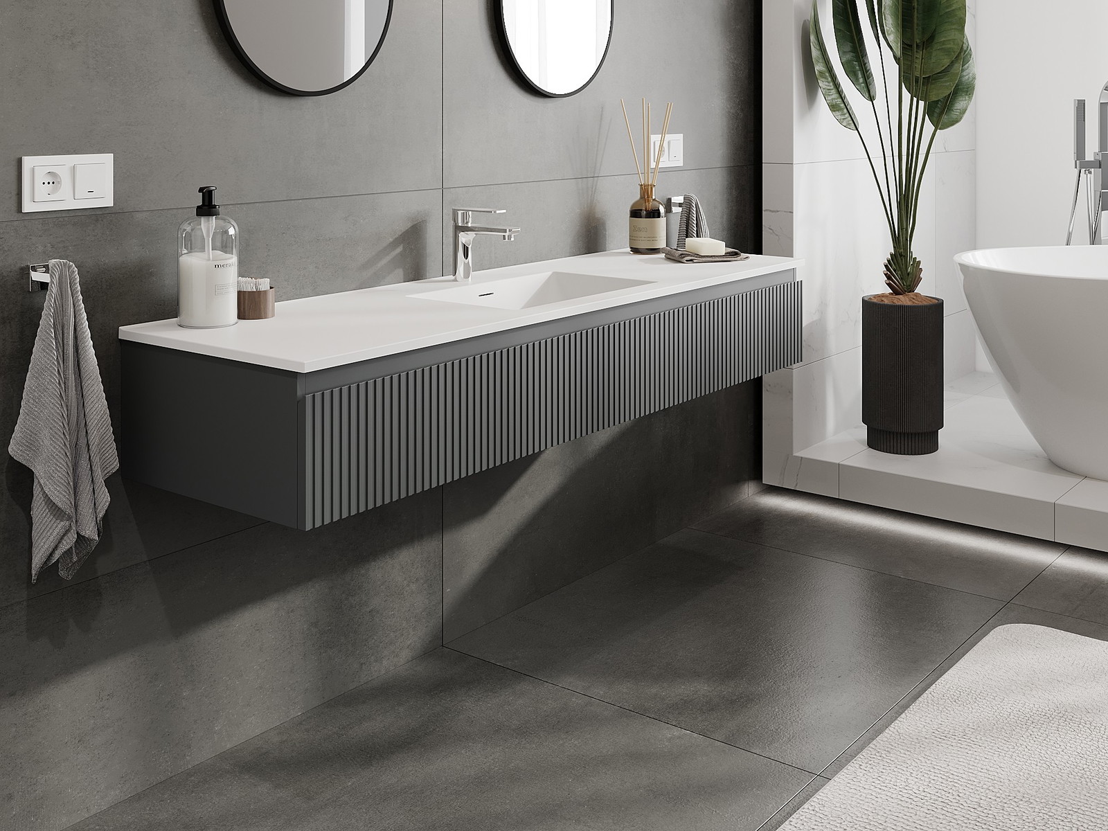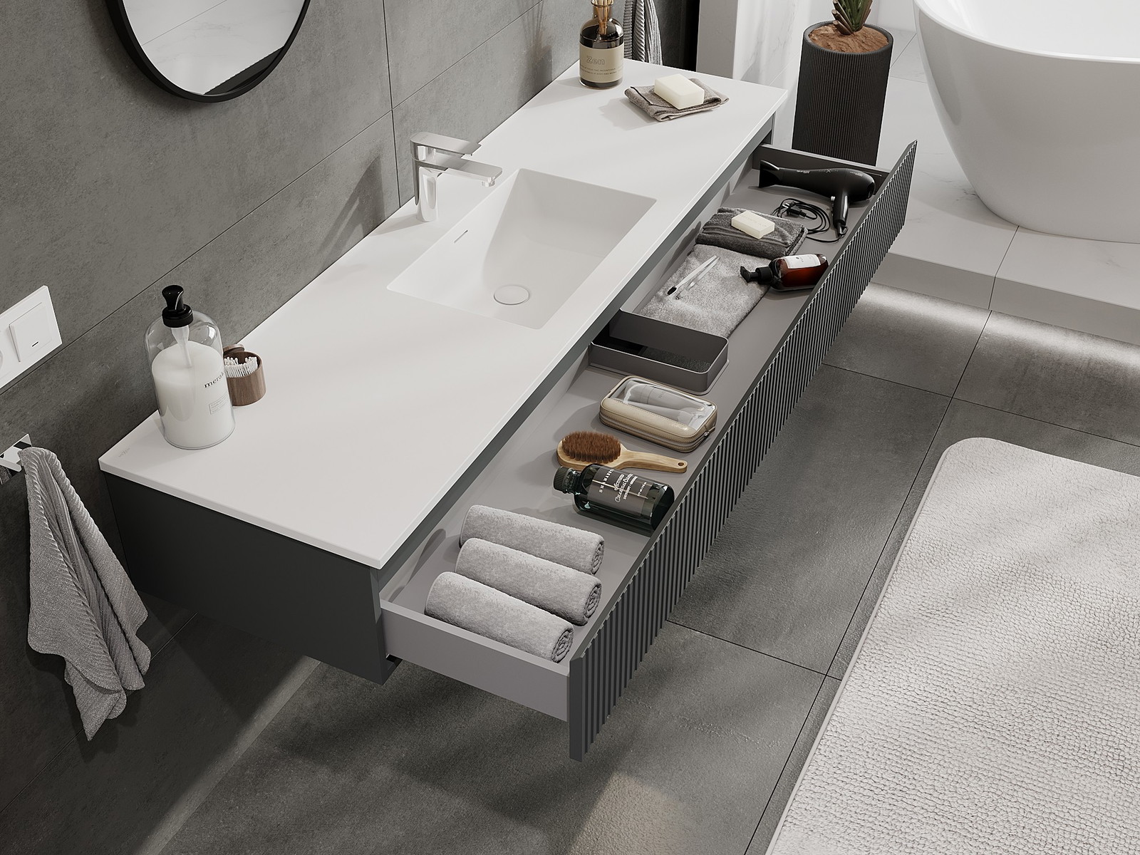 Mexen Rivel armário de casa de banho 160 cm com lavatório Otis, 1 gaveta, canelado, grafite mate/branco mate -
