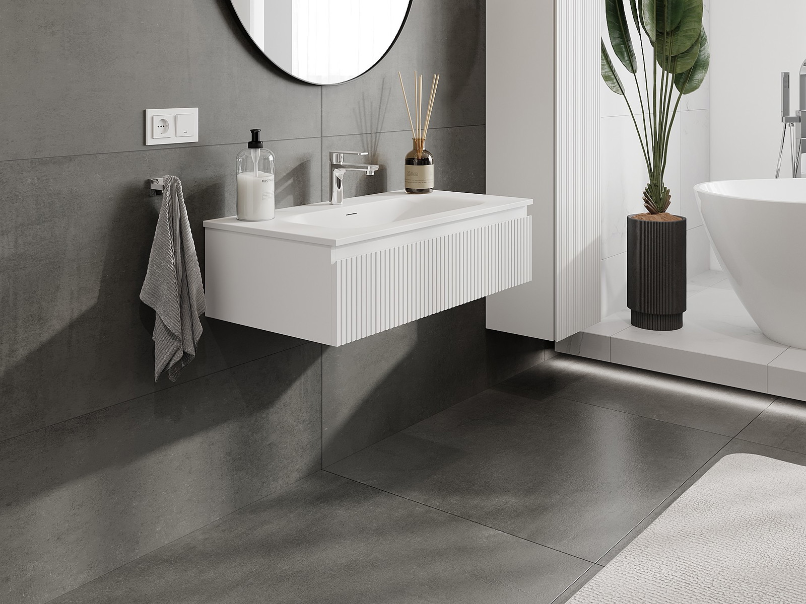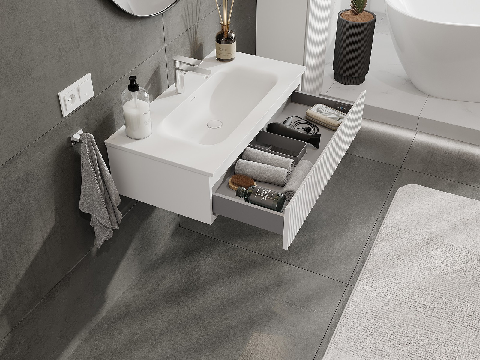 Mexen Rivel armário de casa de banho 90 cm com lavatório Vela, 1 gaveta, canelada, branco mate - 91A20-09023-1-BF01-W23M01