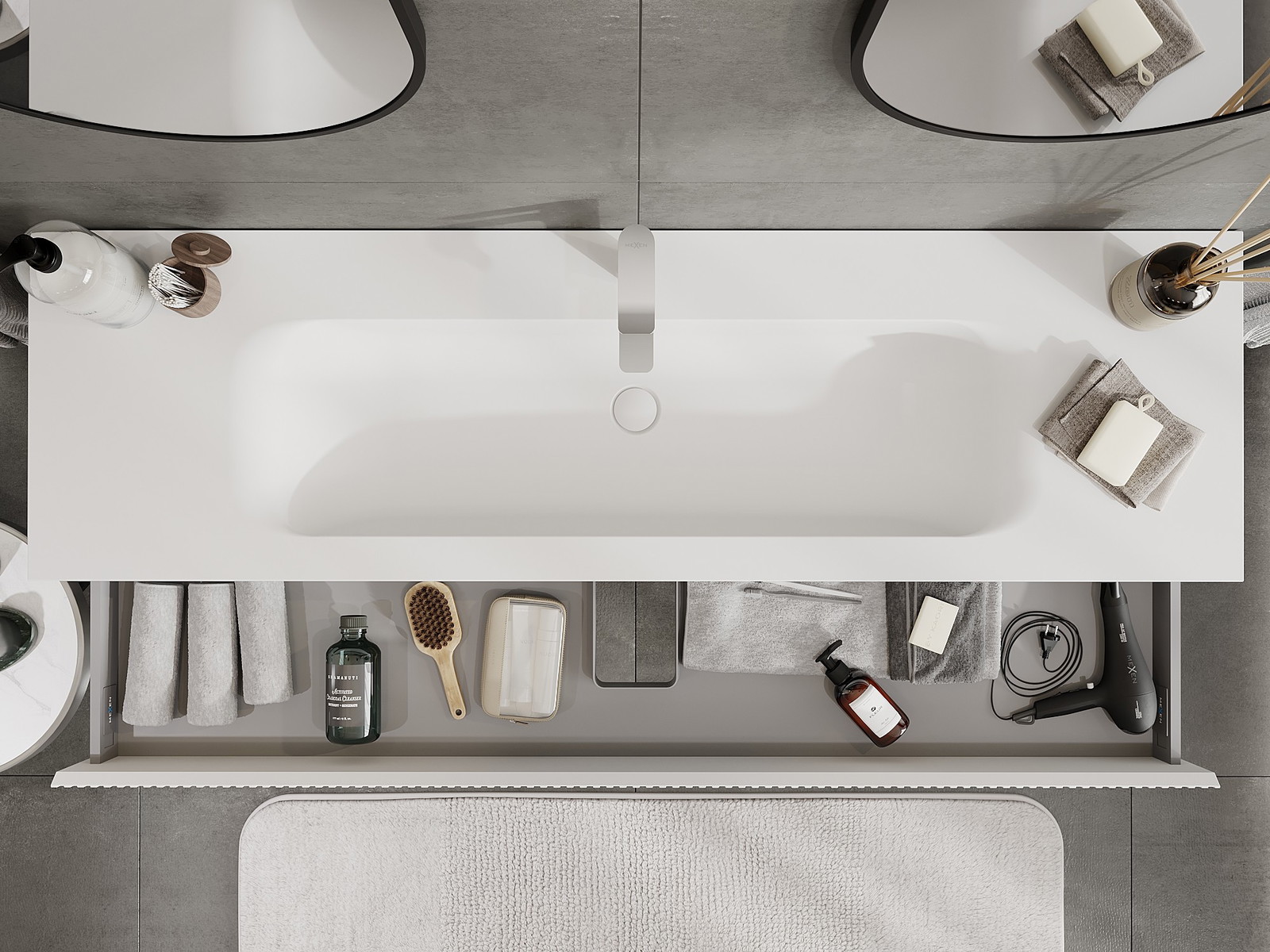 O recorte na gaveta é projetado de forma a acomodar o sifão, que é essencial em instalações de lavatórios. Graças a isso, o móvel pode ser montado de forma totalmente funcional, sem a necessidade de abdicar do espaço da gaveta em prol da instalação.