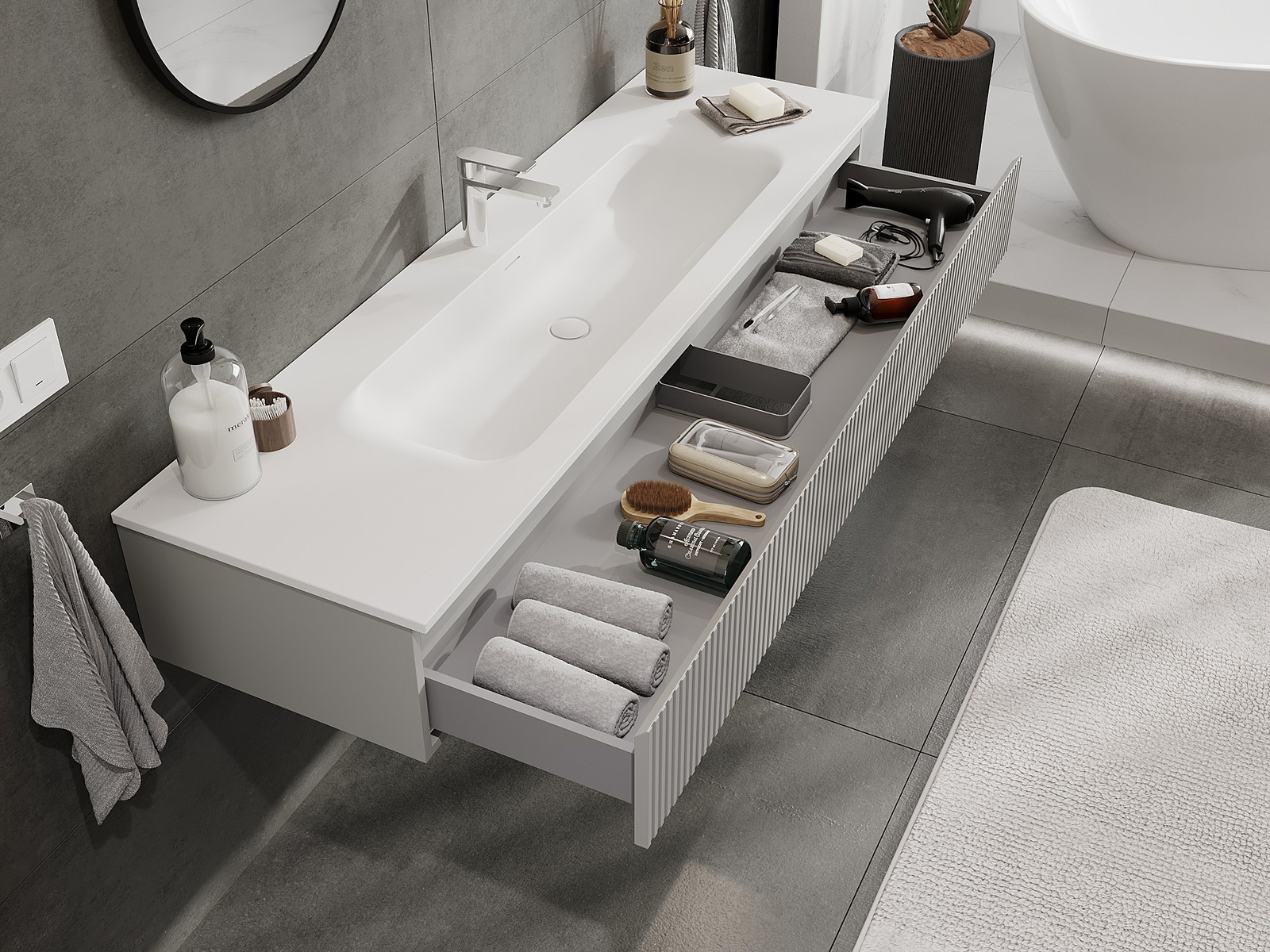 Mexen Rivel armário de casa de banho 140 cm com lavatório Vela, 1 gaveta, frisada, cinza mate/branco mate