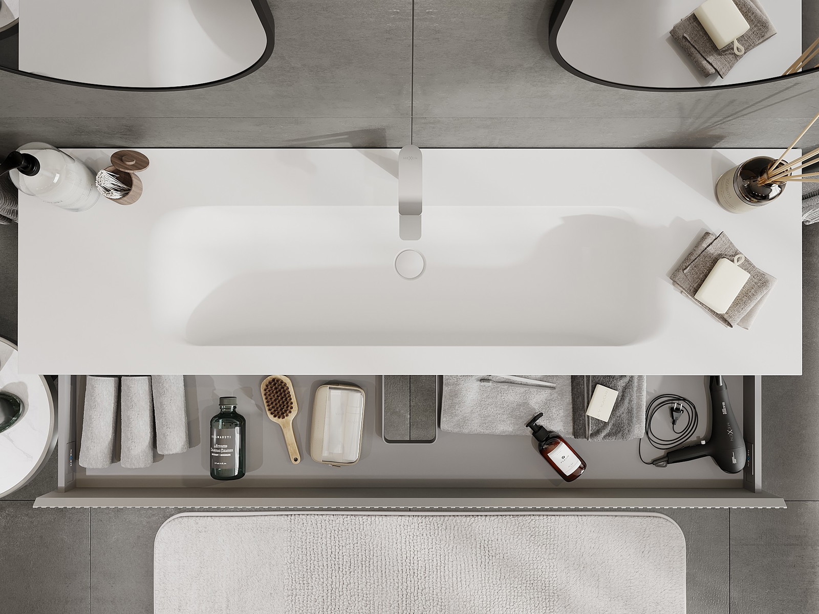 O recorte na gaveta é projetado de forma a acomodar o sifão, que é essencial em instalações de lavatórios. Graças a isso, o móvel pode ser montado de forma totalmente funcional, sem a necessidade de abdicar do espaço da gaveta em prol da instalação.