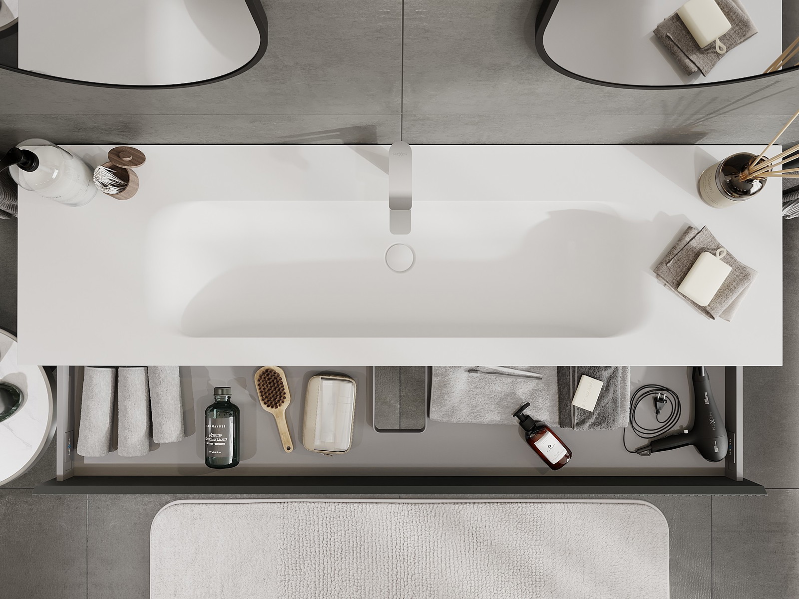 O recorte na gaveta é projetado de forma a acomodar o sifão, que é essencial em instalações de lavatórios. Graças a isso, o móvel pode ser montado de forma totalmente funcional, sem a necessidade de abdicar do espaço da gaveta em prol da instalação.