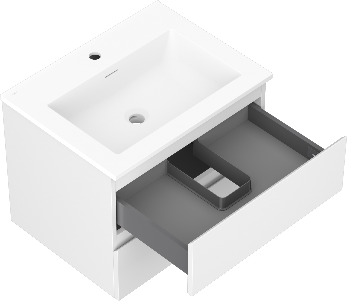 O recorte na gaveta é projetado de forma a acomodar o sifão, que é essencial em instalações de lavatórios. Graças a isso, o móvel pode ser montado de forma totalmente funcional, sem a necessidade de abdicar do espaço da gaveta em prol da instalação.