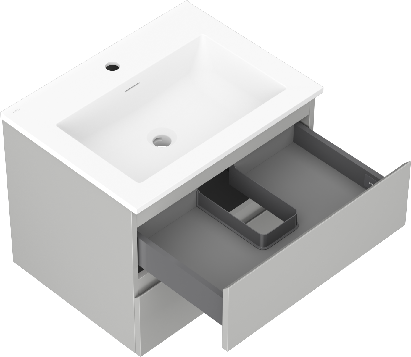 O recorte na gaveta é projetado de forma a acomodar o sifão, que é essencial em instalações de lavatórios. Graças a isso, o móvel pode ser montado de forma totalmente funcional, sem a necessidade de abdicar do espaço da gaveta em prol da instalação.