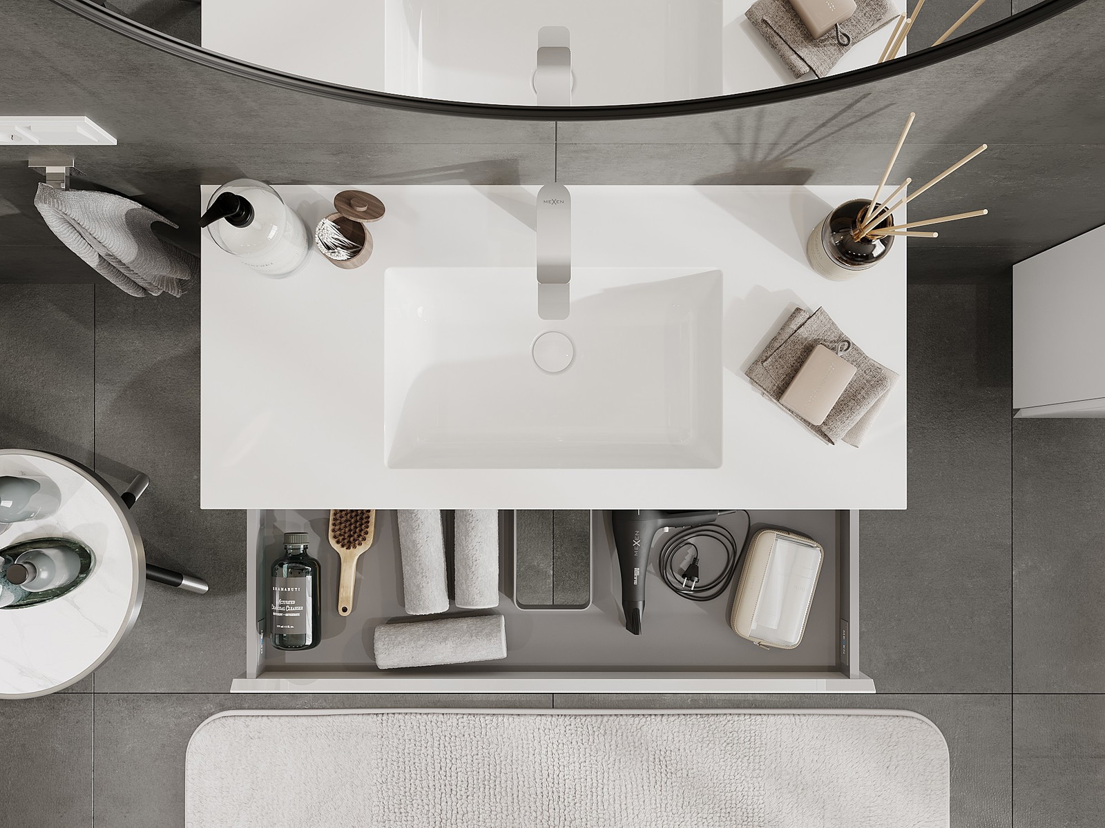 O recorte na gaveta é projetado de forma a acomodar o sifão, que é essencial em instalações de lavatórios. Graças a isso, o móvel pode ser montado de forma totalmente funcional, sem a necessidade de abdicar do espaço da gaveta em prol da instalação.
