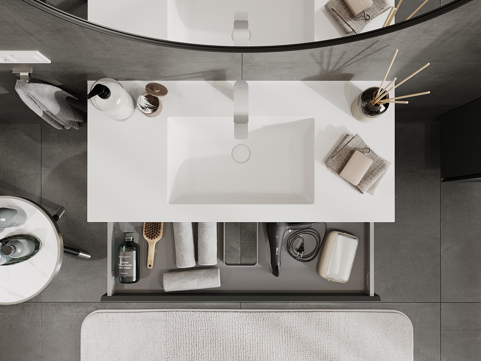 O recorte na gaveta é projetado de forma a acomodar o sifão, que é essencial em instalações de lavatórios. Graças a isso, o móvel pode ser montado de forma totalmente funcional, sem a necessidade de abdicar do espaço da gaveta em prol da instalação.