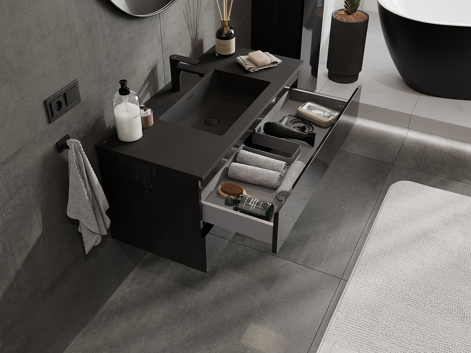 Mexen Orio gaveta de casa de banho 100 cm com lavatório Otis, 2 gavetas, preto brilhante/preto mate