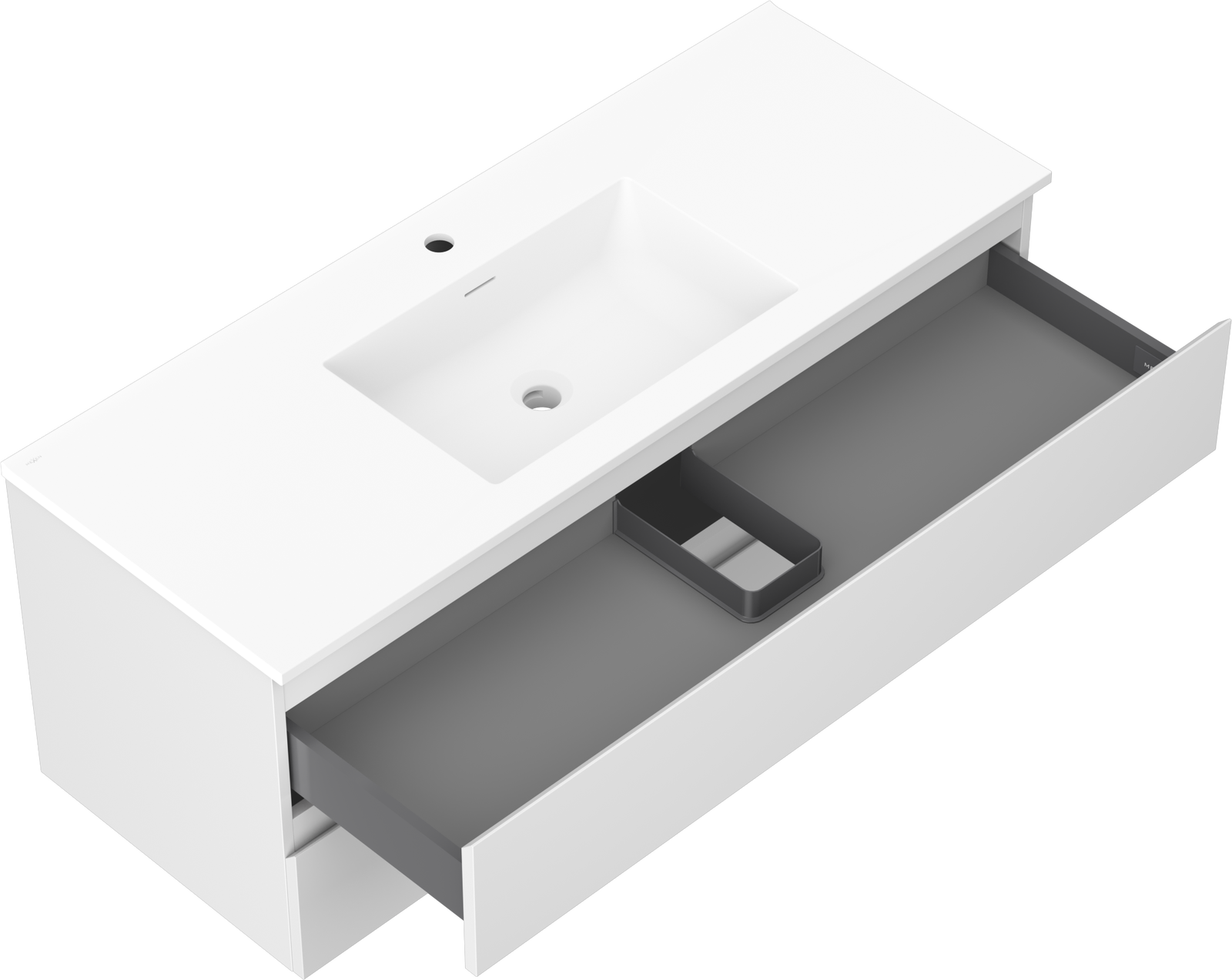 O recorte na gaveta é projetado de forma a acomodar o sifão, que é essencial em instalações de lavatórios. Graças a isso, o móvel pode ser montado de forma totalmente funcional, sem a necessidade de abdicar do espaço da gaveta em prol da instalação.
