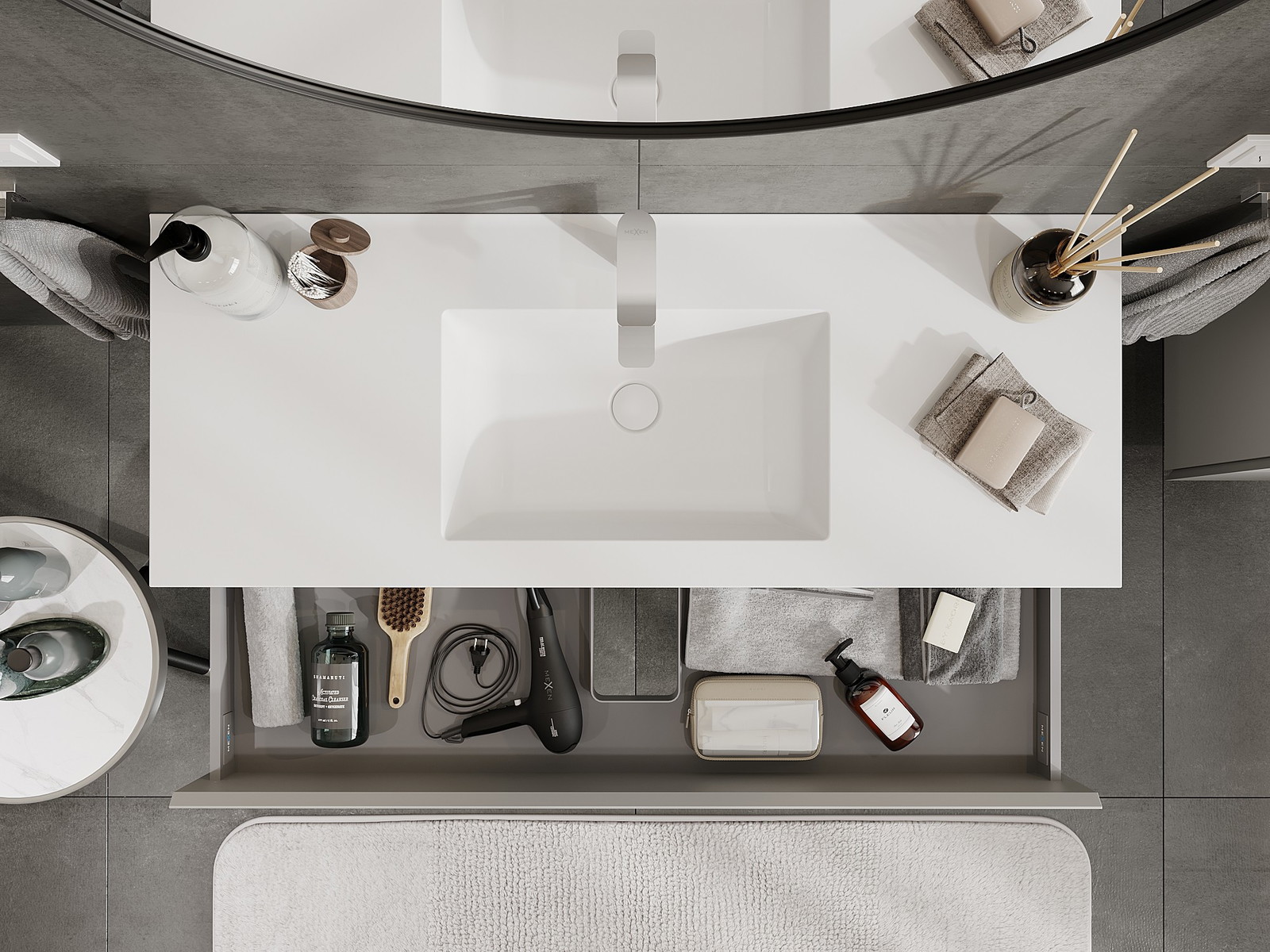 O recorte na gaveta é projetado de forma a acomodar o sifão, que é essencial em instalações de lavatórios. Graças a isso, o móvel pode ser montado de forma totalmente funcional, sem a necessidade de abdicar do espaço da gaveta em prol da instalação.