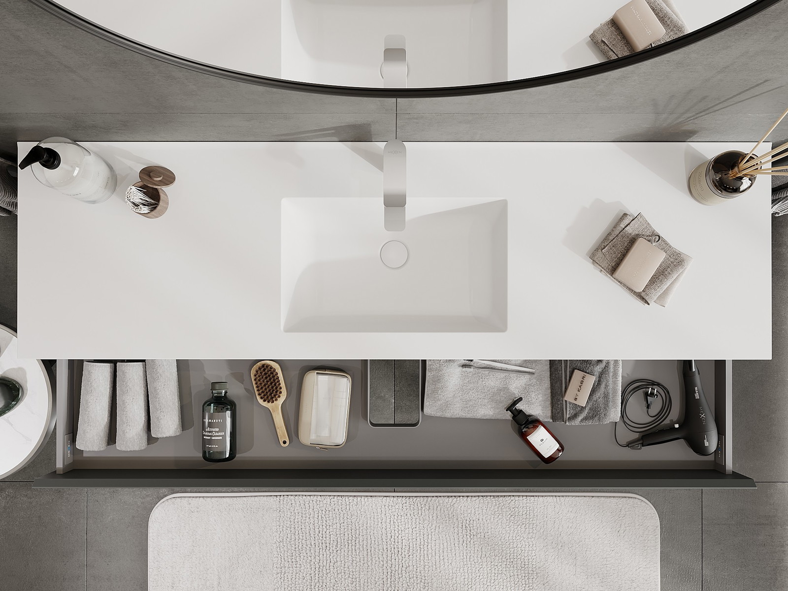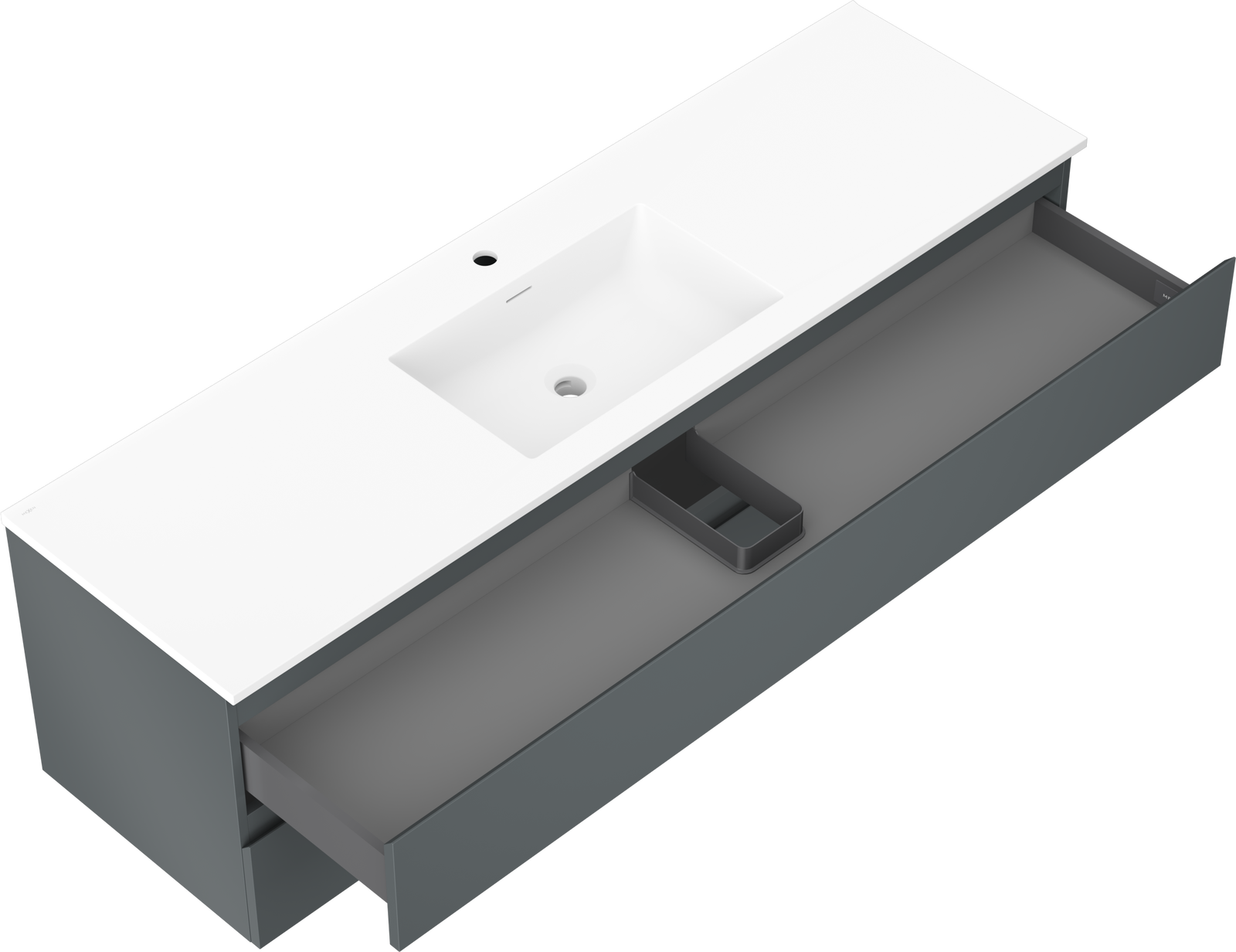 O recorte na gaveta é projetado de forma a acomodar o sifão, que é essencial em instalações de lavatórios. Graças a isso, o móvel pode ser montado de forma totalmente funcional, sem a necessidade de abdicar do espaço da gaveta em prol da instalação.