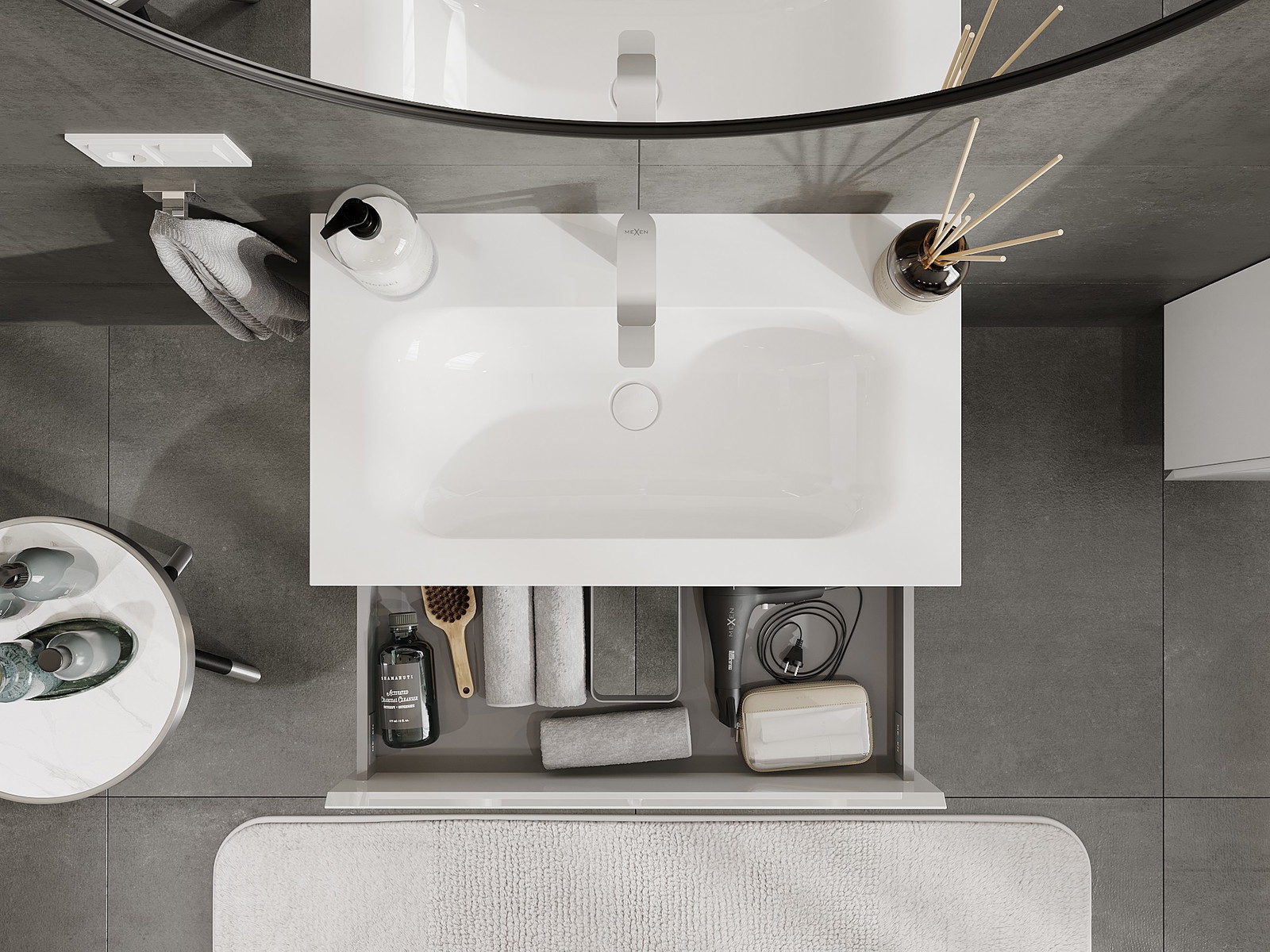 O recorte na gaveta é projetado de forma a acomodar o sifão, que é essencial em instalações de lavatórios. Graças a isso, o móvel pode ser montado de forma totalmente funcional, sem a necessidade de abdicar do espaço da gaveta em prol da instalação.