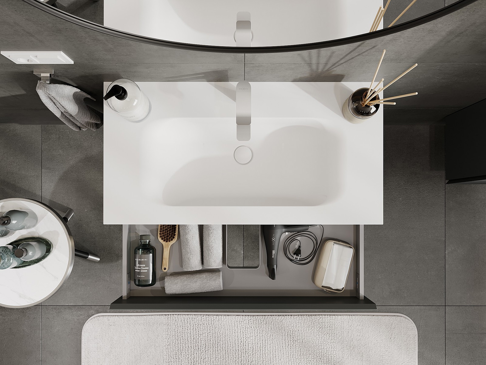 O recorte na gaveta é projetado de forma a acomodar o sifão, que é essencial em instalações de lavatórios. Graças a isso, o móvel pode ser montado de forma totalmente funcional, sem a necessidade de abdicar do espaço da gaveta em prol da instalação.