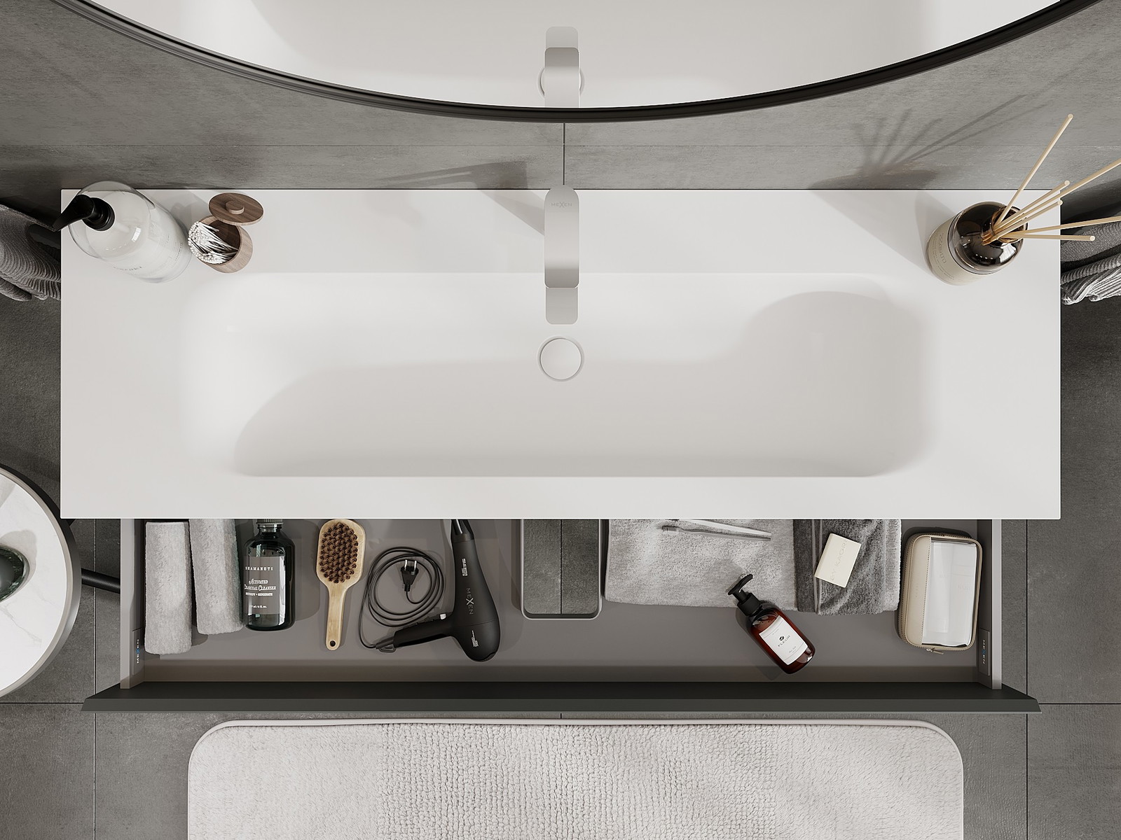 O recorte na gaveta é projetado de forma a acomodar o sifão, que é essencial em instalações de lavatórios. Graças a isso, o móvel pode ser montado de forma totalmente funcional, sem a necessidade de abdicar do espaço da gaveta em prol da instalação.