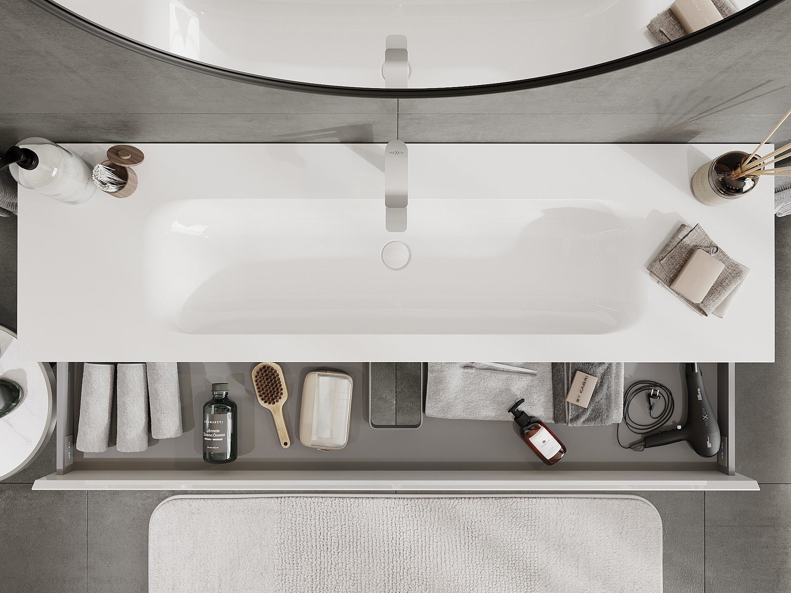 O recorte na gaveta é projetado de forma a acomodar o sifão, que é essencial em instalações de lavatórios. Graças a isso, o móvel pode ser montado de forma totalmente funcional, sem a necessidade de abdicar do espaço da gaveta em prol da instalação.