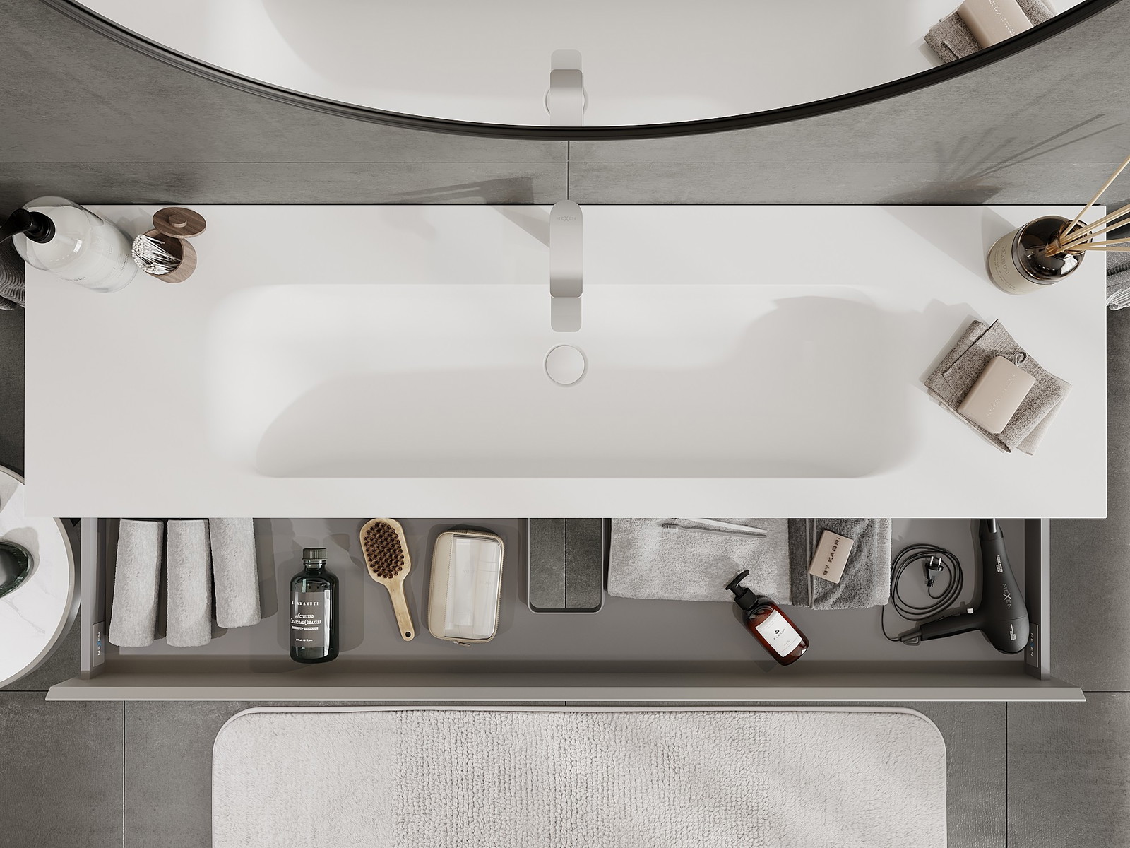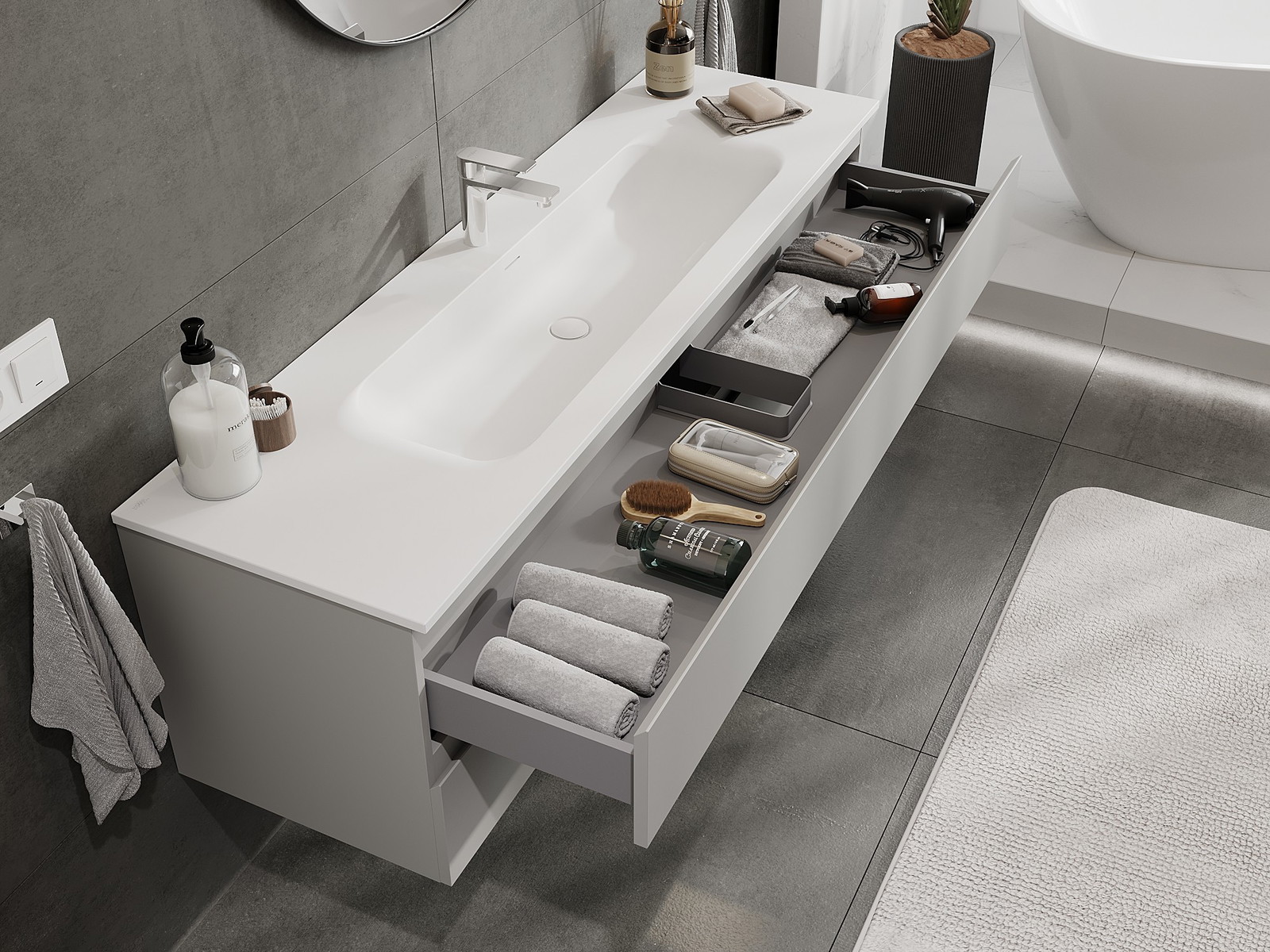 O recorte na gaveta é projetado de forma a acomodar o sifão, que é essencial em instalações de lavatórios. Graças a isso, o móvel pode ser montado de forma totalmente funcional, sem a necessidade de abdicar do espaço da gaveta em prol da instalação.