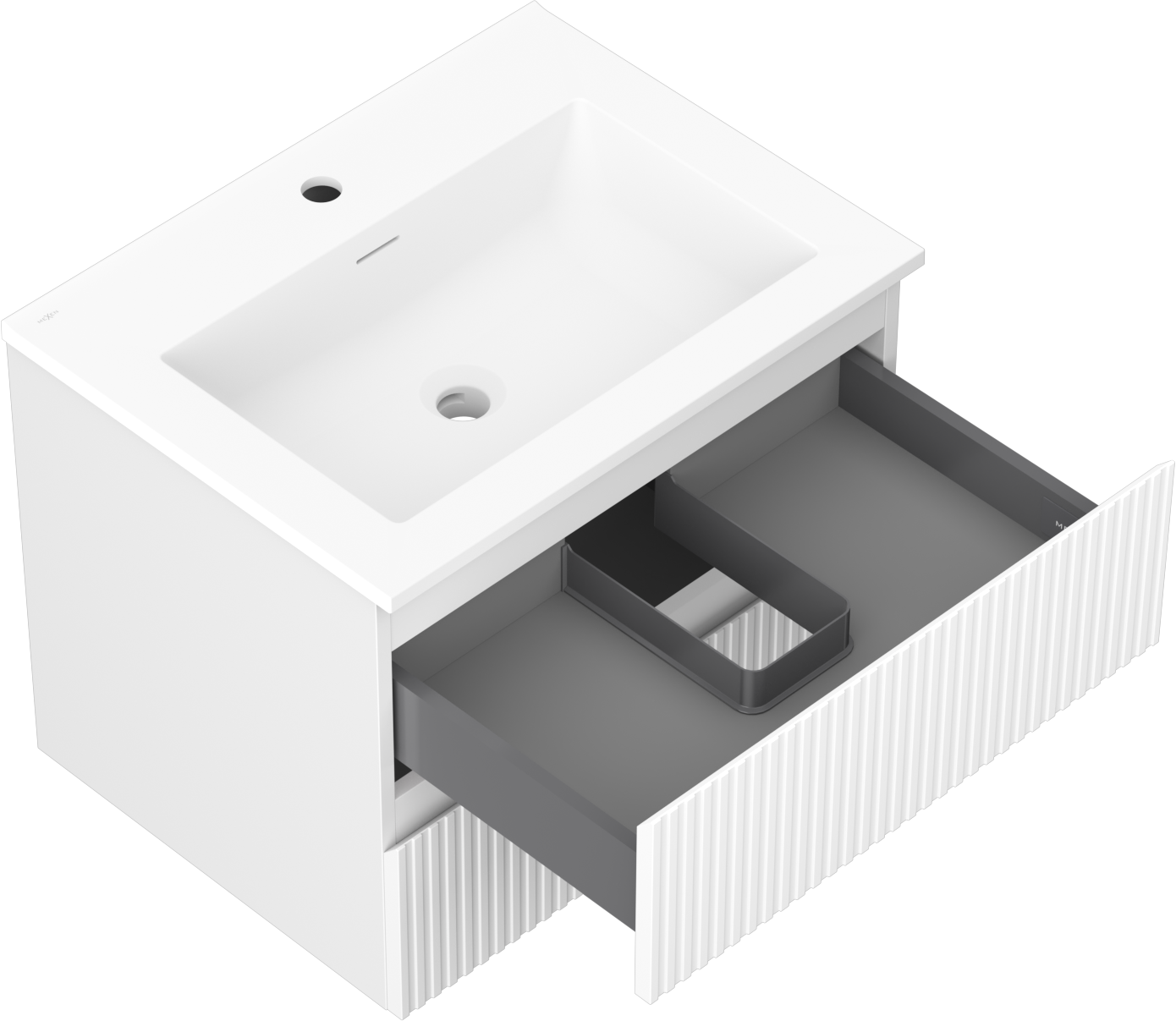 O recorte na gaveta é projetado de forma a acomodar o sifão, que é essencial em instalações de lavatórios. Graças a isso, o móvel pode ser montado de forma totalmente funcional, sem a necessidade de abdicar do espaço da gaveta em prol da instalação.