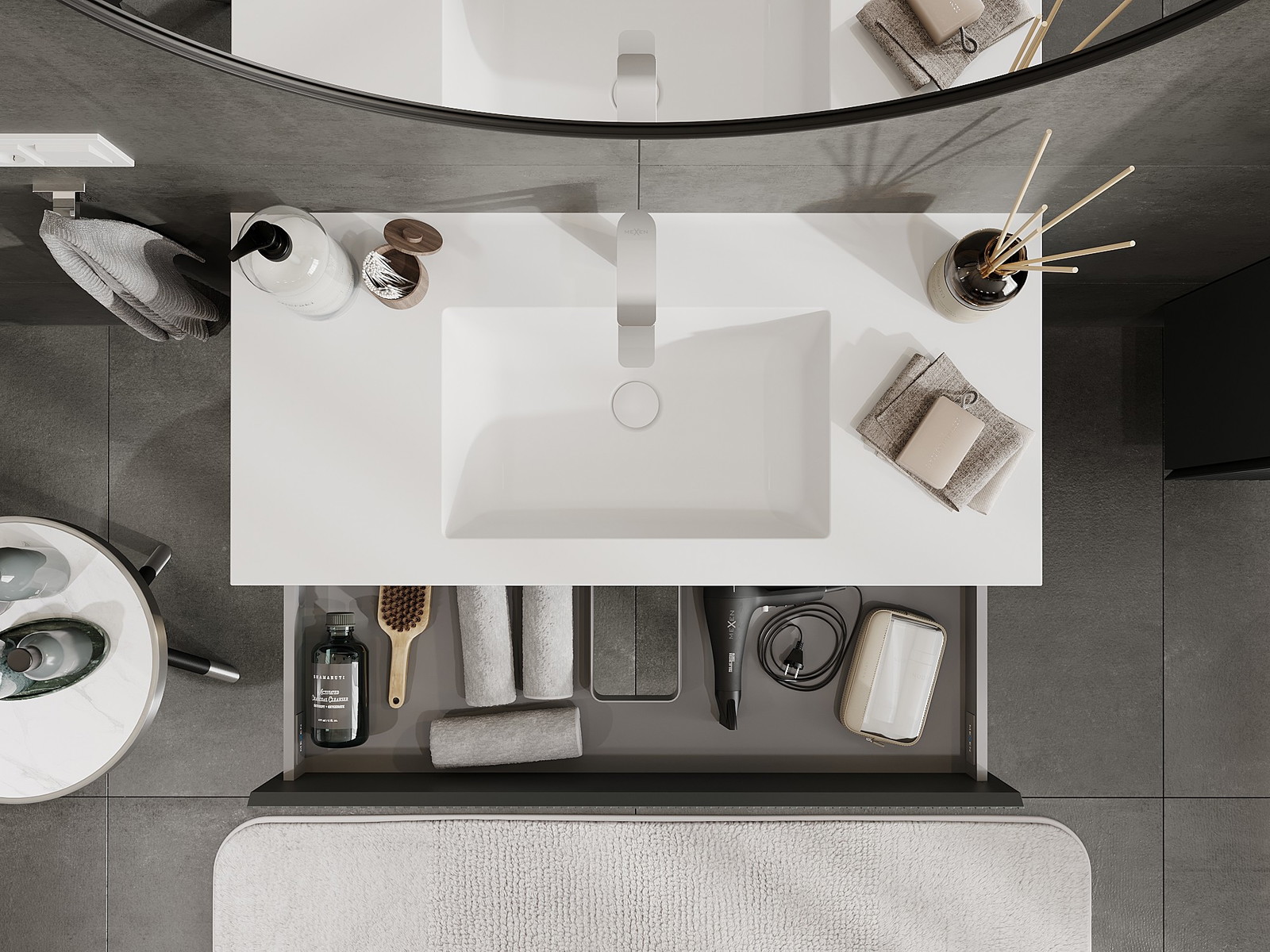 O recorte na gaveta é projetado de forma a acomodar o sifão, que é essencial em instalações de lavatórios. Graças a isso, o móvel pode ser montado de forma totalmente funcional, sem a necessidade de abdicar do espaço da gaveta em prol da instalação.
